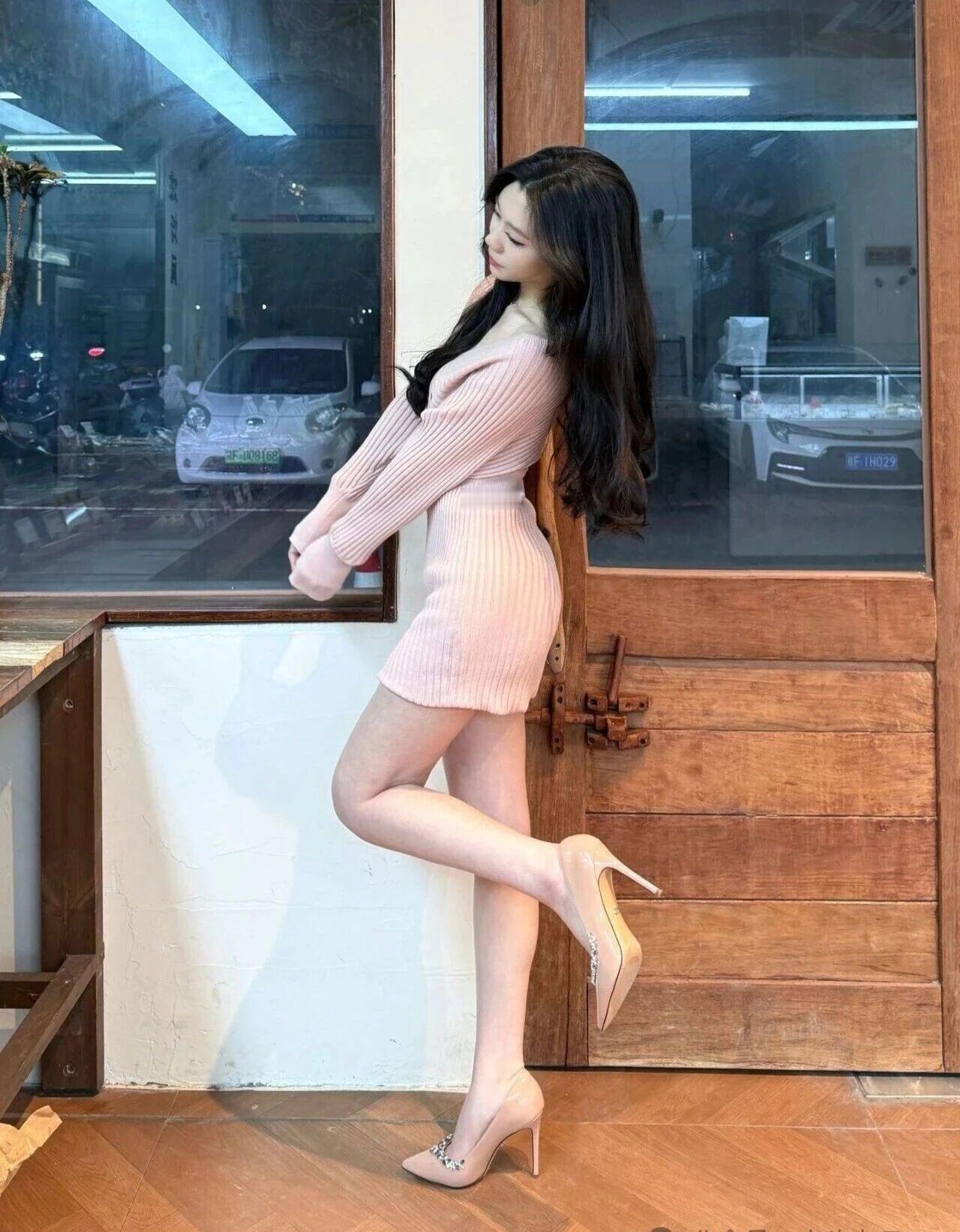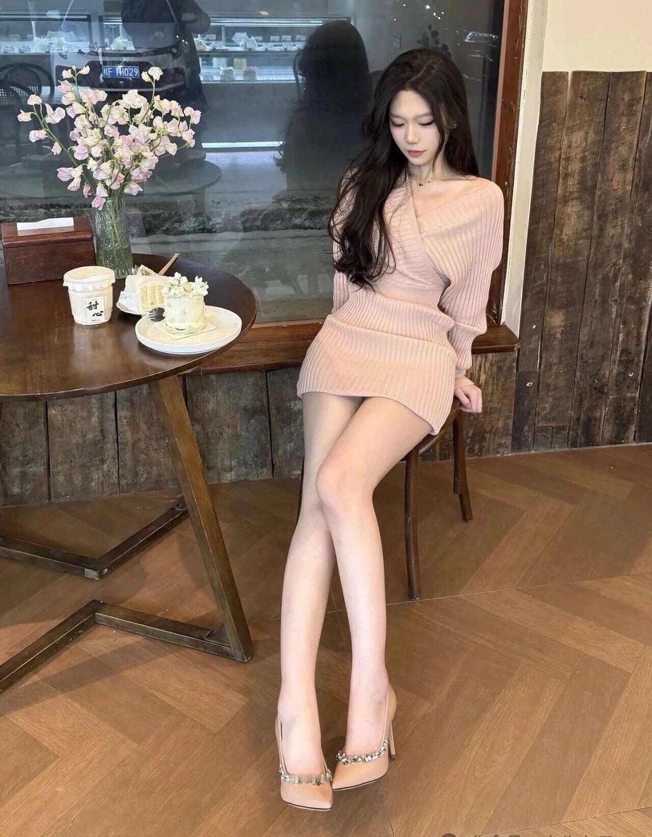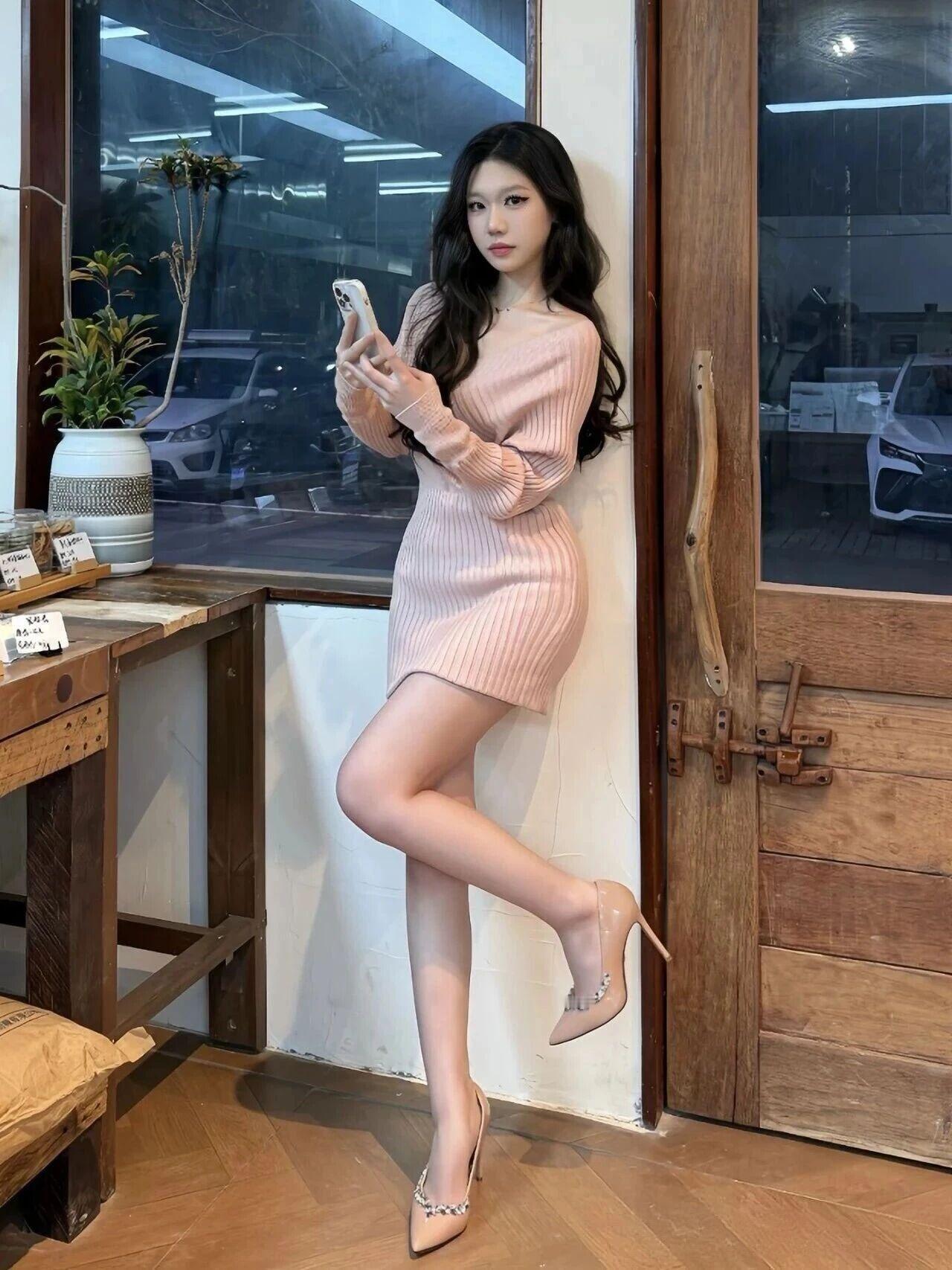 这组照片完美诠释了温柔甜系的下午茶氛围感,将少女的柔美与精致感展现得淋漓尽致。 造型亮点 穿搭:她身着一件浅粉色针织包臀裙,V领设计修饰颈部线条,收腰版型勾勒出曼妙曲线,搭配同色系裸感丝袜与裸色水钻高跟鞋,整体色调柔和又显腿长,温柔又不失性感。 发型妆容:乌黑长卷发自然垂落,妆容清透淡雅,眼妆与唇色都偏向温柔的粉调,与穿搭相得益彰,尽显温婉气质。 场景与氛围 室内场景:在木质桌椅与复古砖墙的咖啡馆里,桌上摆放着鲜花、蛋糕与饮品,暖调光线让画面充满治愈感。她或侧身倚坐,或低头浅笑,姿态慵懒又优雅。 门口场景:在复古木门与落地窗前,她或对镜自拍,或侧身倚靠,单腿微抬的姿势灵动俏皮,将少女的娇俏与自信展现得恰到好处。 整体风格温柔又高级,像是从韩剧里走出来的女主角,每一个瞬间都充满了治愈与心动的感觉。