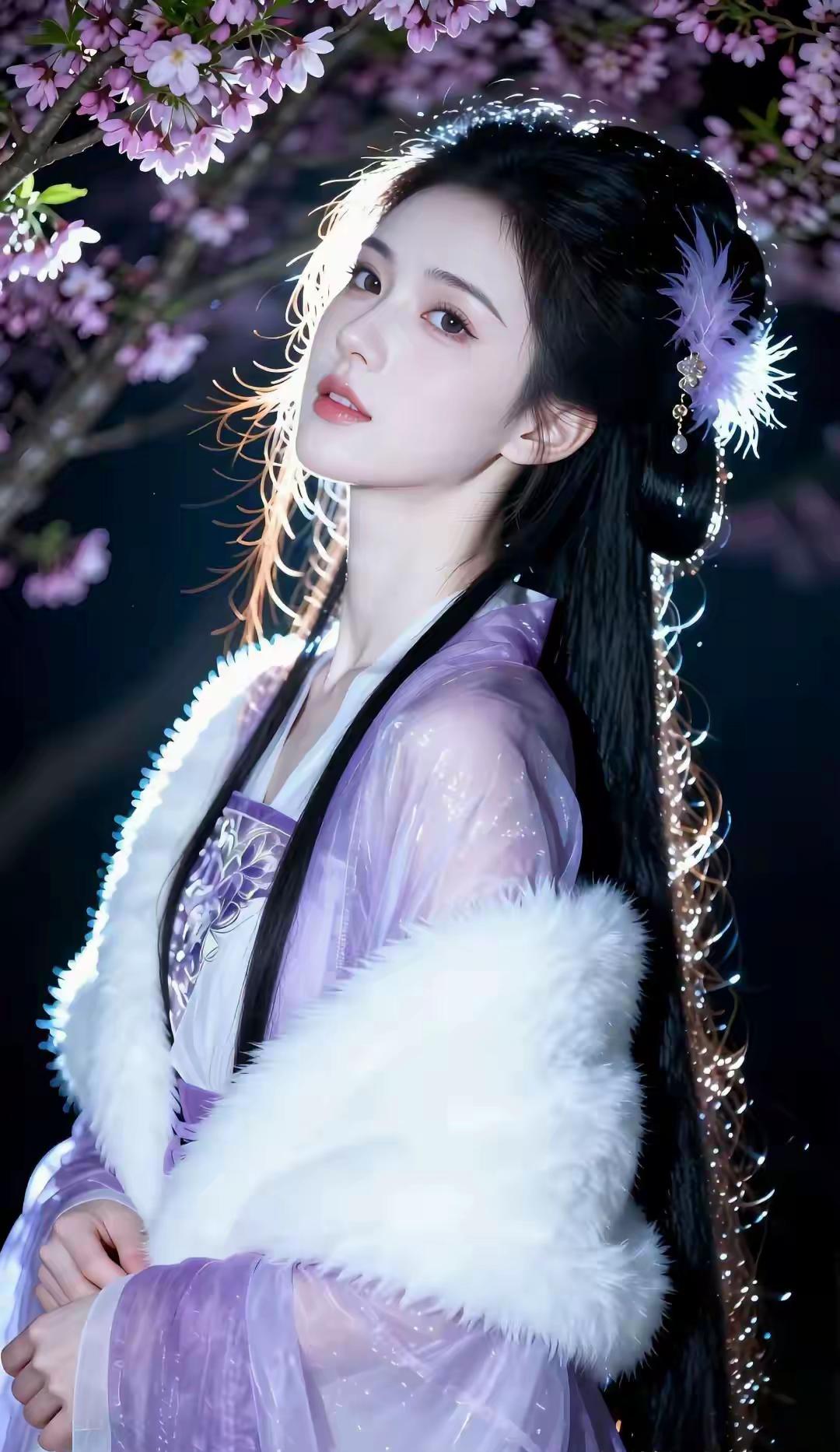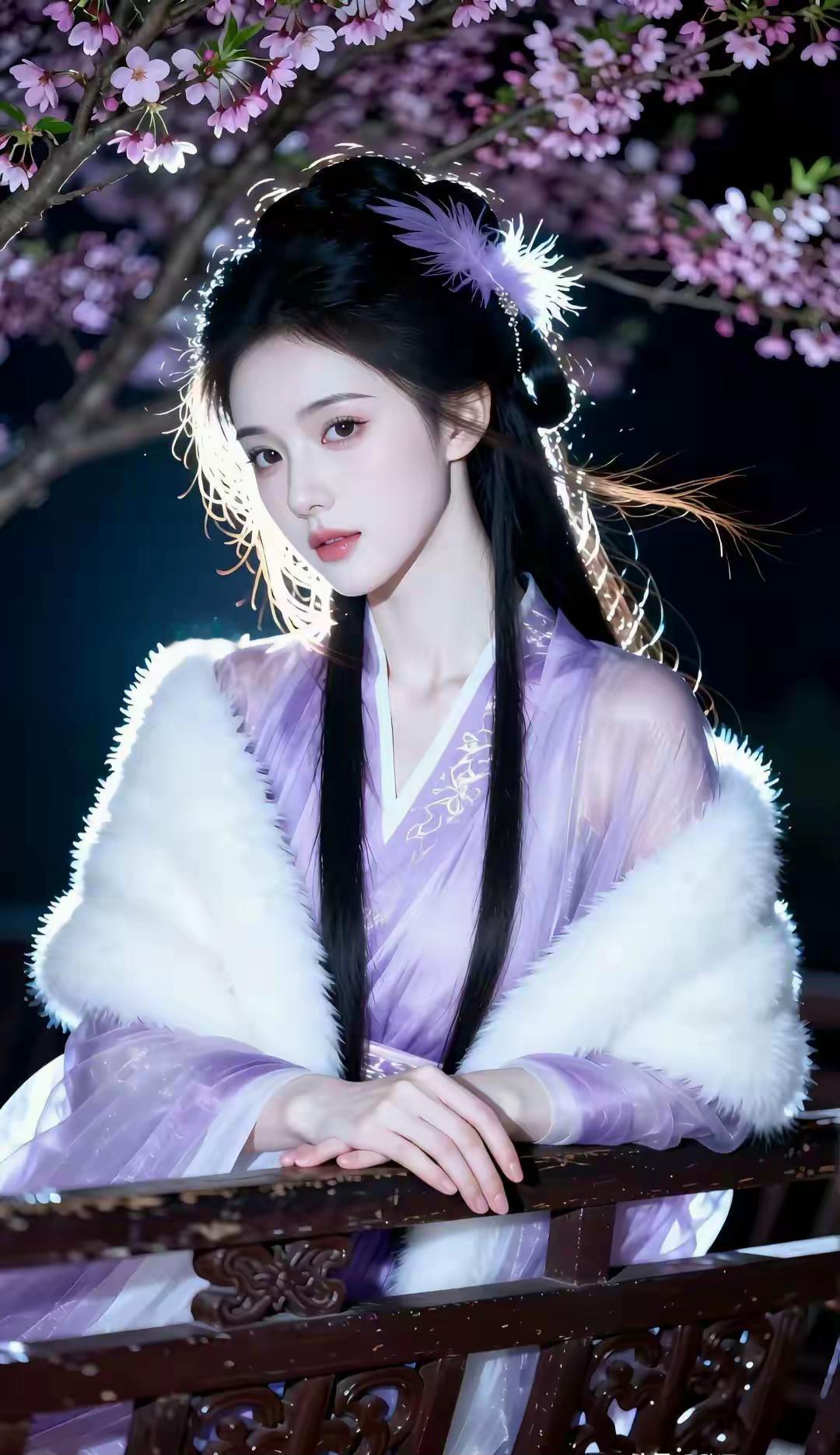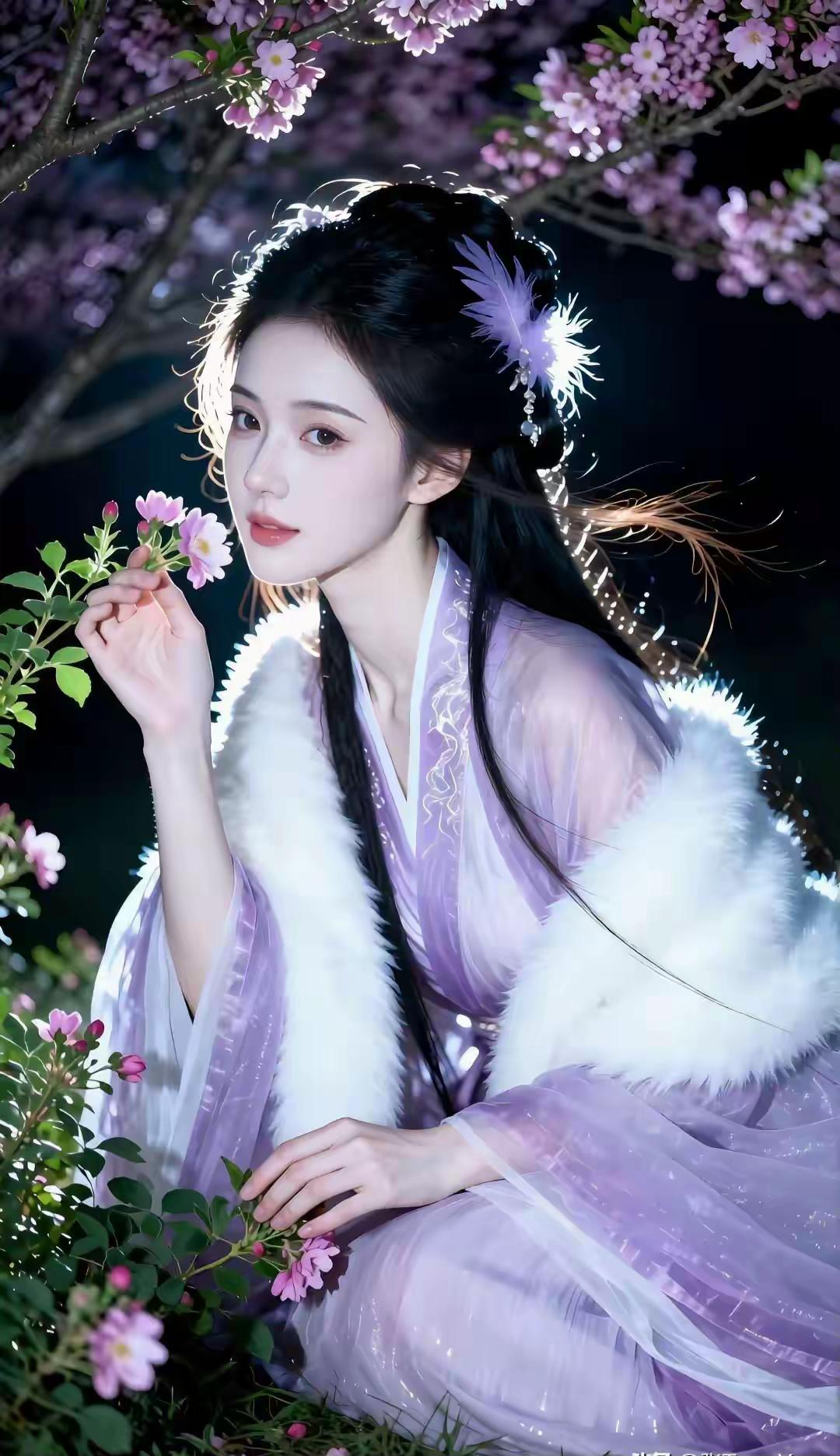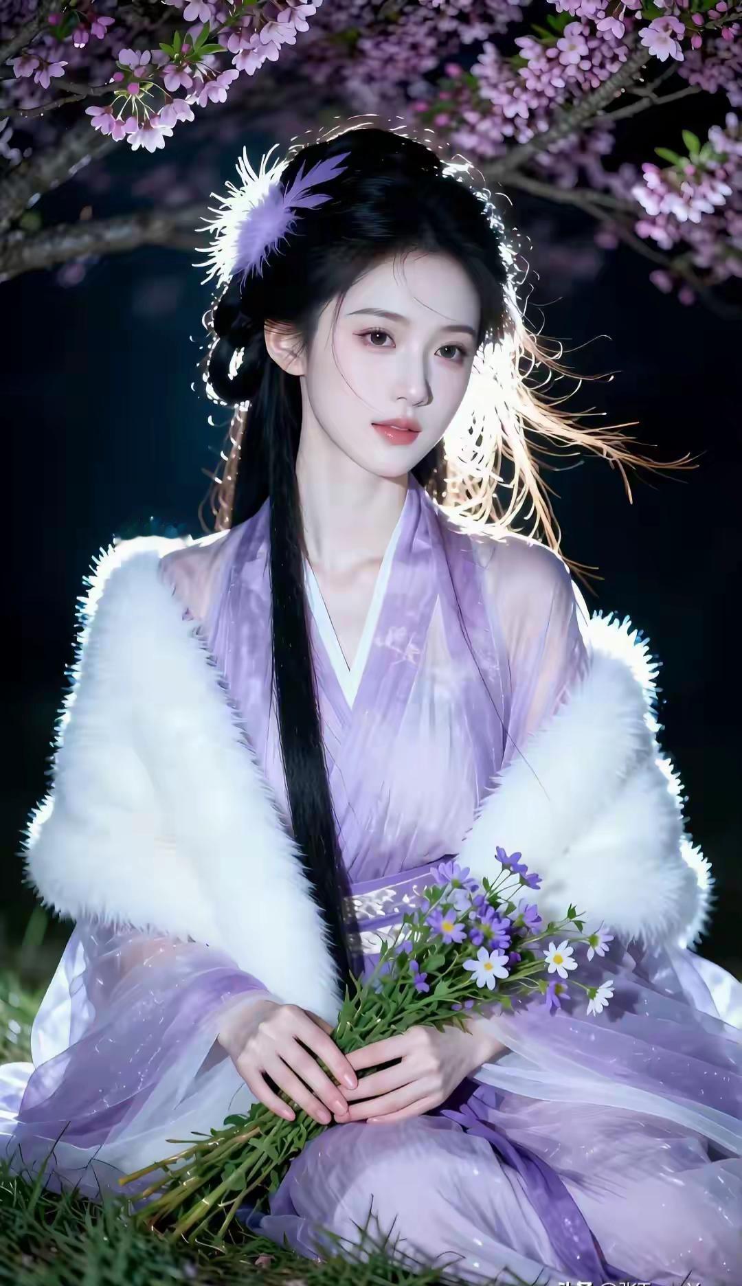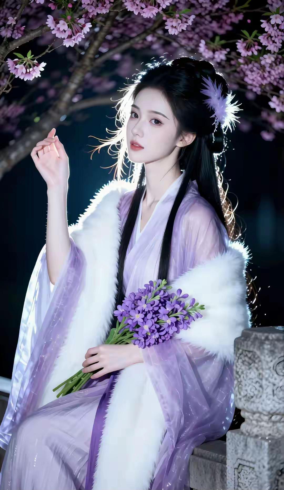 这组写真堪称国风美学的极致呈现,将清冷仙气与温婉柔情完美融合,每一帧都像极了古言小说里走出的贵女。 画面以深邃的夜色为底,漫天粉紫花树垂落,暖光打在发丝与衣袂间,营造出一种梦幻的“暗夜流光”感。人物身着烟霞紫薄纱汉服,质感轻盈通透,搭配厚实的白色狐毛披风,在冷暖对比中既显出冬日的清冽,又透着贵气的娇柔。 造型上,乌黑长发挽成古典发髻,点缀紫色羽毛发饰,与衣色相映成趣,几缕碎发随风轻扬,平添了几分灵动。她或执绘花团扇静坐石栏,或轻拈花枝俯首嗅香,或捧花束于草地凝眸,每一个姿态都舒展自然。 整体气质清冷中透着妩媚,端庄里藏着灵动,将东方女性的柔美身段与优雅韵味展现得淋漓尽致,美得极具辨识度与高级感。