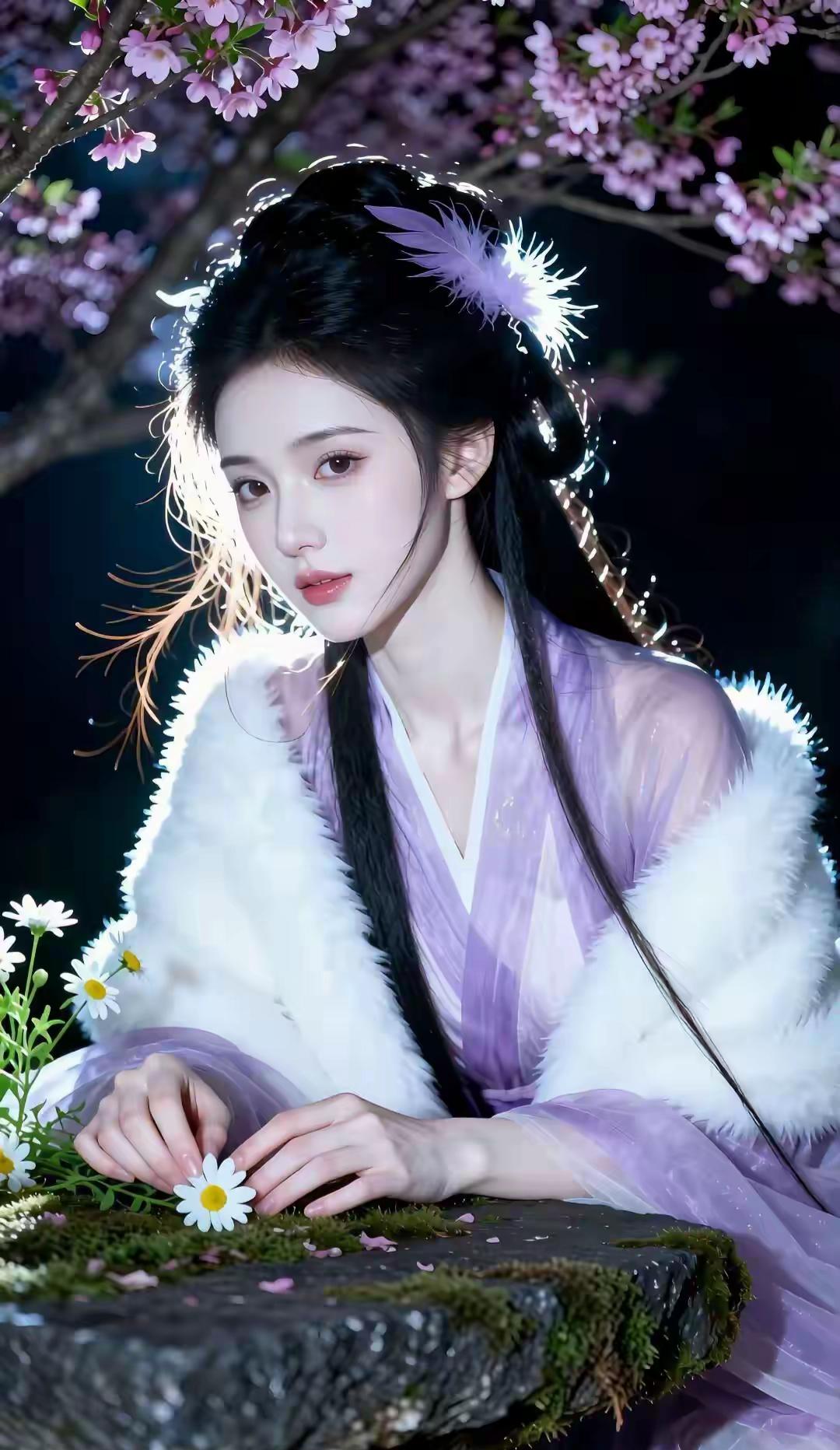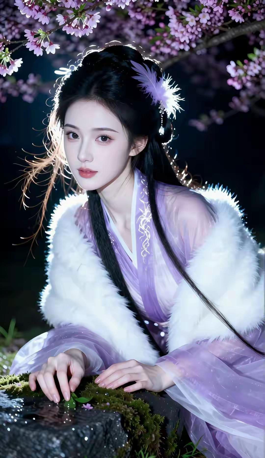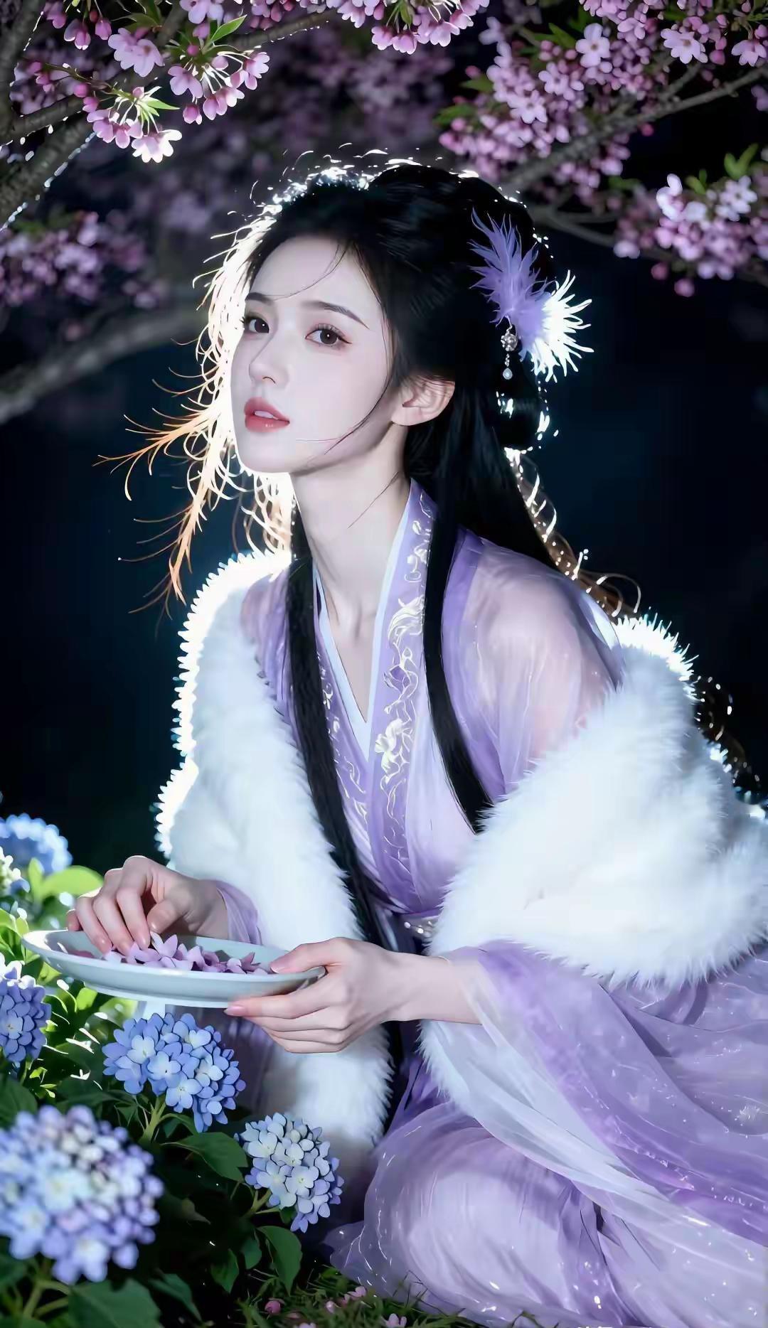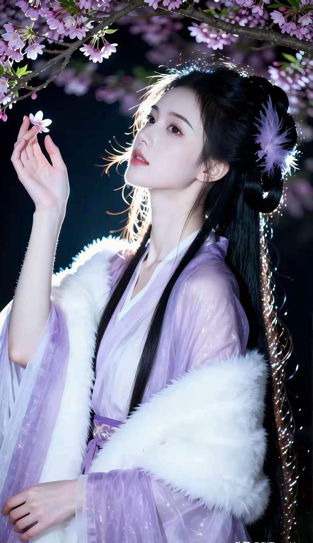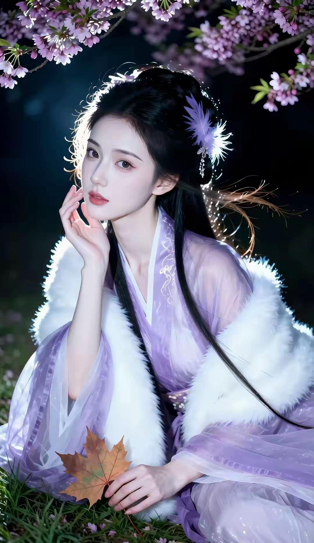 这组写真堪称国风美学的极致呈现,将清冷仙气与温婉柔情完美融合,每一帧都像极了古言小说里走出的贵女。 画面以深邃的夜色为底,漫天粉紫花树垂落,暖光打在发丝与衣袂间,营造出一种梦幻的“暗夜流光”感。人物身着烟霞紫薄纱汉服,质感轻盈通透,搭配厚实的白色狐毛披风,在冷暖对比中既显出冬日的清冽,又透着贵气的娇柔。 造型上,乌黑长发挽成古典发髻,点缀紫色羽毛发饰,与衣色相映成趣,几缕碎发随风轻扬,平添了几分灵动。她或执绘花团扇静坐石栏,或轻拈花枝俯首嗅香,或捧花束于草地凝眸,每一个姿态都舒展自然。 整体气质清冷中透着妩媚,端庄里藏着灵动,将东方女性的柔美身段与优雅韵味展现得淋漓尽致,美得极具辨识度与高级感。