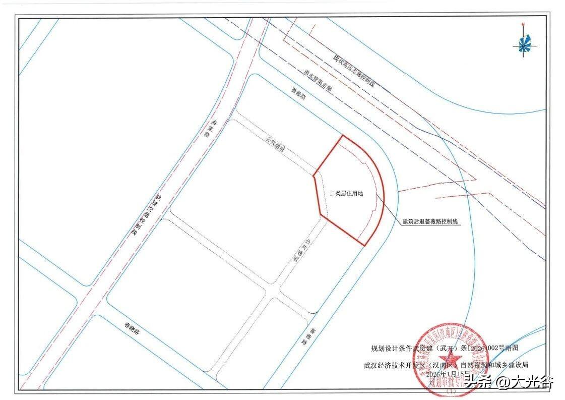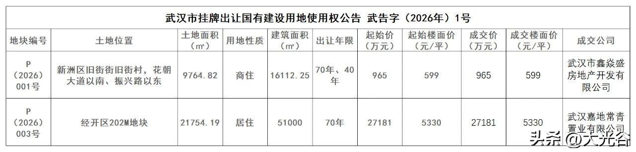 武汉2026年首批涉住宅地块出让成交 武告字(2026 年)1 号公告的 2 宗地块已于2026 年 2 月 25 日全部成交,均以底价出让,总成交金额2.8146 亿元。马年首场土拍由两家民营企业分获地块,整体表现平稳。 P(2026)001 号地块,地块位于新洲区旧街街旧街村,花朝大道以南、振兴路以东,总用地面积9764.82㎡,为商住混合用地,计容建面约16112.25㎡,容积率 **≤1.65**,建筑限高 **≤32 米 **,以多层低密产品为主。 该地块起始总价965 万元,起始楼面价约599 元 /㎡,竞买保证金与起始价等额,资金门槛低、开发成本友好,适合打造区域商业配套与小型住宅社区,是新洲旧街板块的小型优质商住载体。 P(2026)003 号地块出自武告字(2026 年)1 号土拍公告,是武汉经开区 202M 地块(经开永旺旁)的纯居住用地,于 2026 年 1 月 23 日挂牌、2 月 25 日 9:30 揭牌,由武汉嘉地常青置业有限公司以2.7181 亿元底价成交,出让年限 70 年。 地块位于蔷薇路与海棠路交汇处,总用地面积21754.19㎡(约 32.63 亩),计容建面约 51000㎡,容积率≤2.34,起始楼面价约5330 元 /㎡,竞买保证金 5437 万元。地处经开永旺核心商圈,周边商业、交通配套成熟,适中的容积率具备打造面向改善人群的中高端住宅社区的潜力,是经开区 2026 年初住宅市场的重要新增供应。
