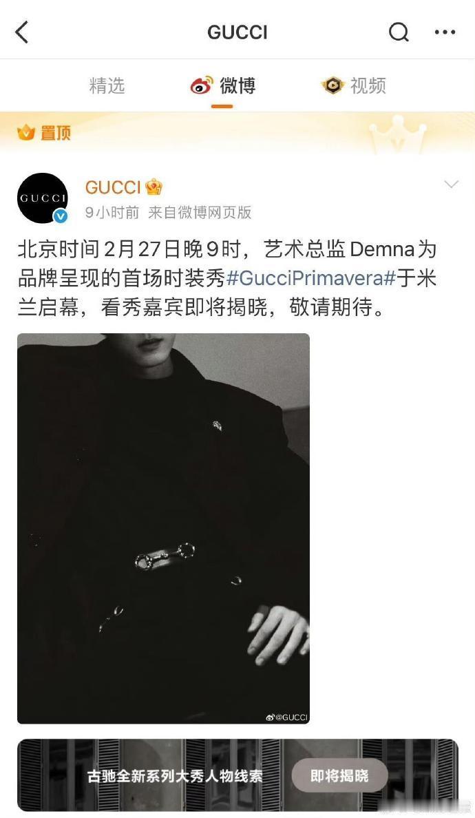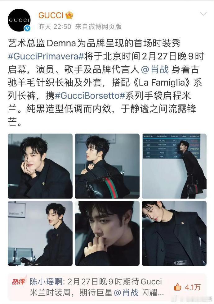 肖战GUCCI外网首位唯一官宣嘉宾GUCCI给肖战的时装周待遇每一次合作都是双向认可,肖战成为GUCCI外网首位且唯一官宣看秀嘉宾,国内官博专属置顶预热,这样的时装周待遇,实至名归。