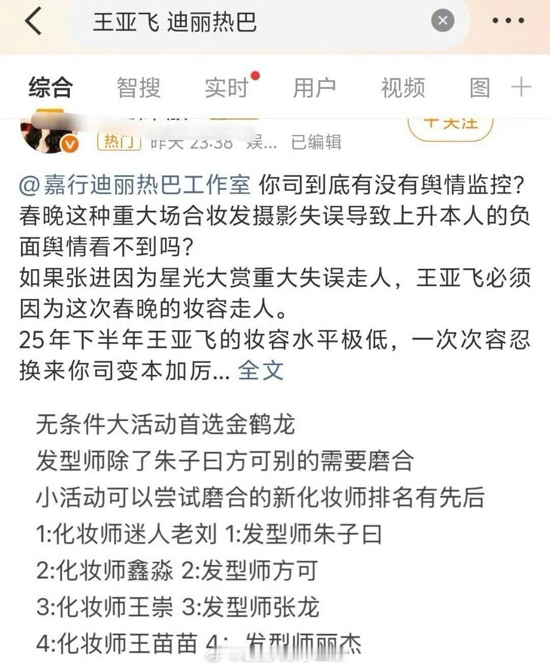 王亚飞 迪丽热巴迪丽热巴粉丝维⭕,要求时装周换掉王亚飞,讲真,春晚是灯光的问题更