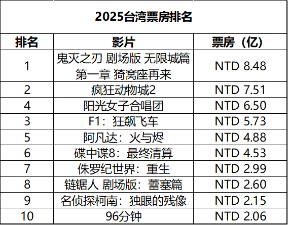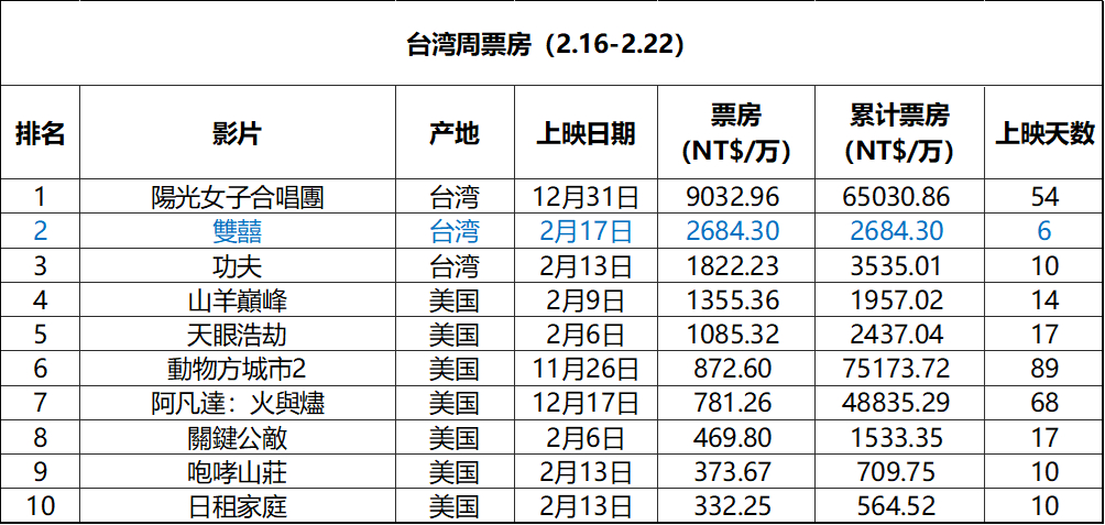 2026年第8周台湾票房 :1. 众多贺岁新片不敌《阳光女子合唱团》,依旧稳居冠军,累计票房6.5亿新台币排名台湾影史第12;2.《双喜》开画成绩不错;3.《疯狂动物城2》累计票房7.51亿排名台湾影史第8。(单位:新台币 数据:台湾电影及视听文化中心)
