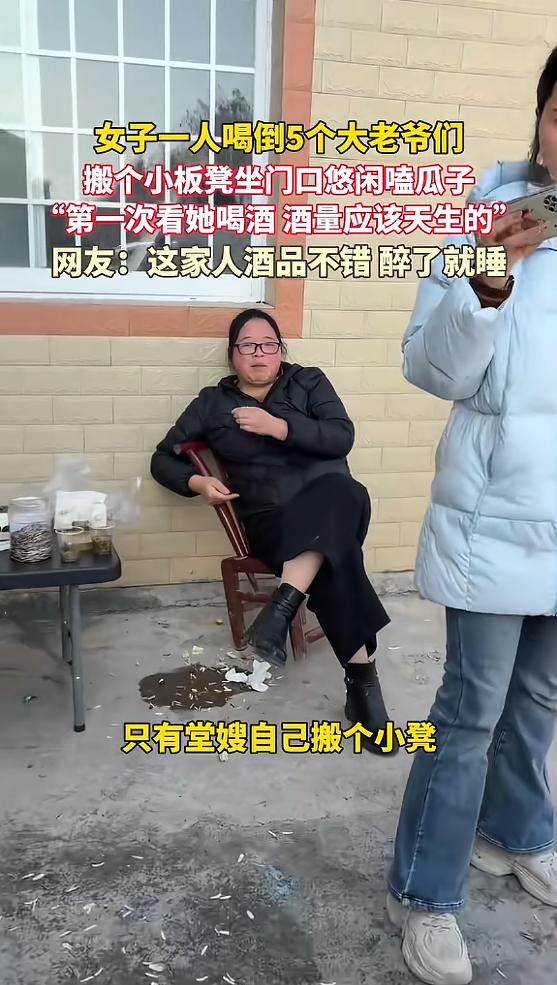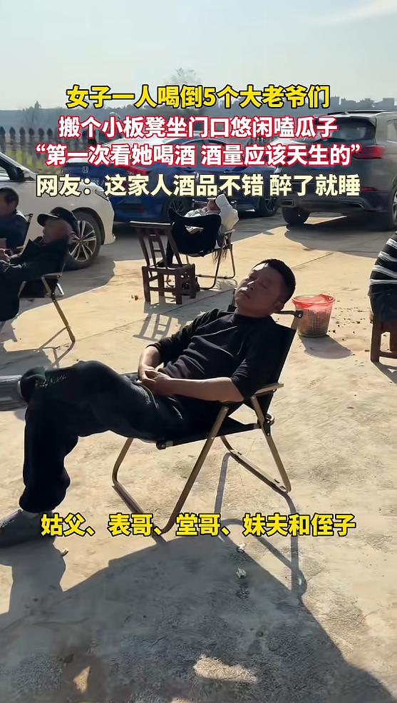 “太能喝了!”近日,湖北恩施,一女子在家庭聚餐时,发现酒桌上的亲戚最后全都醉倒,撑不住跑去睡觉,只有平时不怎么喝酒的堂嫂一人坐在椅子上,悠闲地嗑着瓜子,除了脸有点红以外,竟一点醉意也没有!网友:天赋异禀啊! 近日湖北恩施,一场普通的家庭聚餐,意外火遍全网。 大过年的本来是走亲访友、欢聚团圆的日子,这户人家凑了一大家人吃饭,酒桌上5个大老爷们儿推杯换盏,热闹得不行,谁也没料到,最后竟被平时从不喝酒的堂嫂“拿捏”了。 这场聚餐上,姑父、表哥、堂哥、妹夫还有侄子,5个男性亲属围坐一桌,摆上白酒啤酒,一边聊一年的家常,一边互相敬酒比拼酒量,语气里满是豪爽,还时不时念叨“没人能陪我们好好喝一场,太无聊了”。 28岁的堂嫂一开始没凑这个热闹,安安静静待在小孩桌旁,陪着小朋友吃饭聊天,全程以茶代酒。 嫁过来三年,她从来没沾过酒,家里人都默认她不胜酒力,没人会劝她喝酒。 看着男人们喝得兴起,堂嫂终于放下茶杯,笑着起身走过去:“你们这样喝太无聊了,我来陪你们喝几杯吧。” 这话一出,桌上瞬间安静,接着就是一阵哄笑。 姑父摆了摆手调侃:“丫头别闹,我们喝的是白酒,你一个女孩子家,喝杯饮料就行,喝醉了难受。” 表哥也跟着附和:“就是啊嫂子,我们这是男士较量,你别掺合,免得还要我们照顾你。” 堂嫂没反驳,拉过椅子坐下,拿起空酒杯放在面前:“我没闹,既然敢坐过来,就肯定能陪你们喝,不用让着我,该怎么喝就怎么喝。” 见她态度坚决,5个男人也没再多说,想着陪她玩一会儿,压根没把这个平时滴酒不沾的嫂子放在眼里。 没曾想,堂嫂拿起酒瓶给自己倒满一杯白酒,仰头一饮而尽,面不改色,既没皱眉也没咳嗽,放下酒杯笑着说:“我喝完了,你们随意。” 这一下,5个男人全愣住了,姑父率先反应过来,笑着叫好,也跟着干了一杯。 接下来的一个小时里,5个男人轮番向堂嫂敬酒,有的敬白酒,有的敬啤酒,甚至还调了“深水炸弹”,可堂嫂来者不拒,喝完还能从容聊天,眼神清亮,一点醉意都没有。 反观那5个男人,渐渐没了底气,侄子最先撑不住,趴在桌上呼呼大睡,紧接着妹夫瘫在沙发上,说话含糊不清,堂哥和表哥也坐立不稳,语无伦次,最后姑父也扛不住,瘫在椅子上沉沉睡去。 等到酒局结束,屋里一片狼藉,5个大老爷们横七竖八倒着睡觉,只有堂嫂脸色微微发红,依旧精神十足。 她从容收拾完桌上的空酒瓶,搬了个小板凳坐在门口,掏出一把瓜子,慢悠悠地嗑着,眼神淡淡地扫过屋里醉倒的亲戚,格外淡定。 有人随手拍下这一幕发到网上,很快就火了,网友纷纷感慨“天赋异禀”。 其实从这件事能看出来,堂嫂的酒量大概率是天生的,毕竟三年来从没喝过酒,不可能是后天练出来的。 而且这场酒局全程都是自愿,没有劝酒逼酒,醉了就安安静静睡觉,这样的家庭氛围特别难得。 不过也有人设想,可能堂嫂只是平时低调,不想张扬酒量,毕竟不是所有人都喜欢在酒桌上表现自己。 还有一点很关键,喝酒终究伤身体,这场热闹只是家庭聚会的小插曲,没必要刻意模仿比拼酒量。 不管酒量好不好,适量饮酒才是最重要的,团圆的意义从来不是喝多少酒,而是一家人聚在一起的欢喜。 对此您有什么不同的看法,可以在评论区留言讨论!!! 信息来源:《女子一人喝倒5个大老爷们,搬个小板凳坐门口悠闲嗑瓜子,"第一次看她喝酒,酒量 应该天生的”网友:这家人酒品不错,醉了就睡。》杭州网