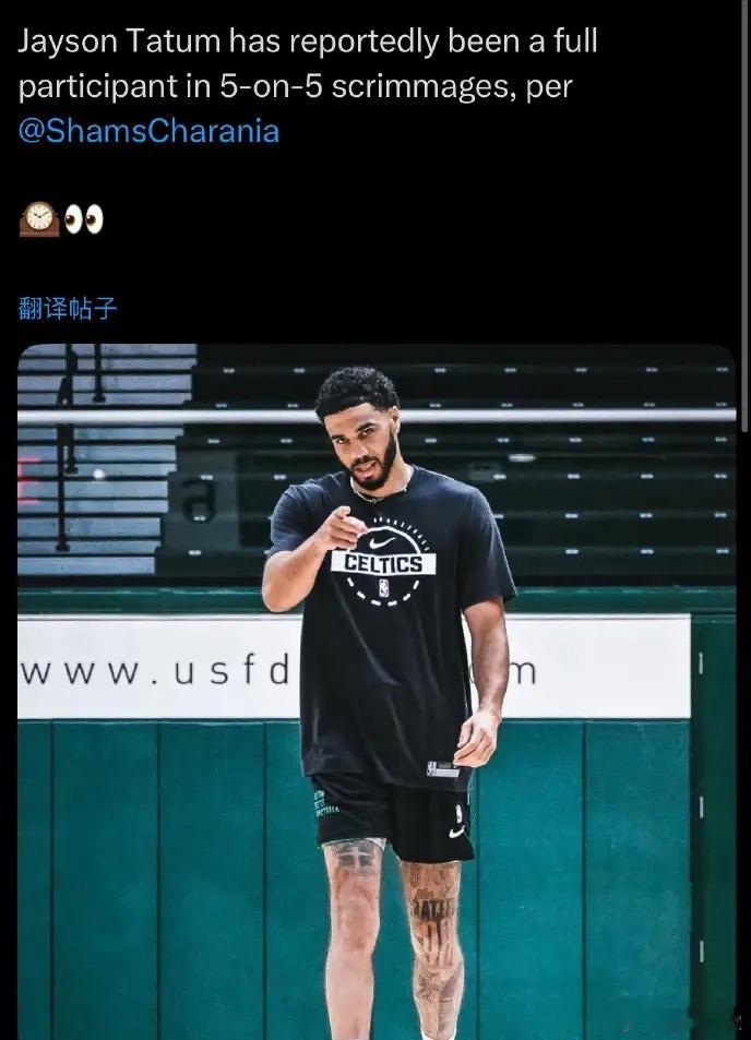 目前塔图姆已经可以全程参加5v5对抗训练,他的身体机能已经基本恢复,现在如果是季后赛的关键场次,塔图姆八成就可以直接打了。