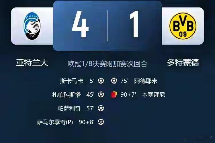亚特兰大4比1多特蒙德亚特兰大4-1多特蒙德先看亚特兰大主场迎战多特蒙德这一场,首回合多特2-0占得先机,但回到主场的亚特兰大显然不答应轻易认输,一开场就给德甲劲旅来了个下马威——第5分钟,亚特兰大左路打出精妙配合,一记低平球扫到小禁区后点,斯卡马卡拍马赶到轻松推射破门,这记闪击进球让主场球迷瞬间沸腾,总比分被改写为1-2,悬念重新燃起。图片来源于网络多特门将科贝尔此后成了场上最忙碌的人,高接低挡多次化解险情,但第45分钟亚特兰大卷土重来,左路传中被顶出后,扎帕科斯塔在禁区前沿得球稍作调整,右脚轰出一记世界波,皮球击中防守球员变线入网,2-0!总比分来到2-2,双方回到同一起跑线。图片来源于网络易边再战,亚特兰大的攻势依旧凶猛,第57分钟德容恩在禁区左侧送出一记精准过顶斜传,后点的帕萨利奇高高跃起头槌破门,3-0!亚特兰大不仅反超总比分,还让多特陷入了绝境,眼看多特就要被淘汰出局,第75分钟阿德耶米站了出来——他在右路带球内切,与队友打出撞墙配合后,在禁区前沿左脚兜出一记美妙的弧线球直挂死角,1-3!多特将总比分顽强地扳成3-3平,比赛进入白热化阶段。