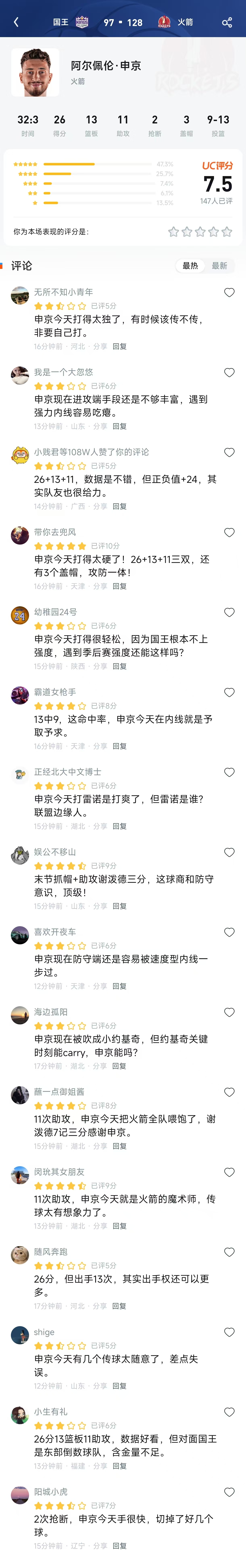 【原始UC评分截图区】 球员: 阿尔佩伦·申京(火箭) 时间: 32:23 | 得分: 26 | 篮板: 13 | 助攻: 11 | 抢断: 2 | 盖帽: 3 投篮: 13投9中 UC评分: ⭐⭐⭐⭐⭐ 7.5分(147人已评)