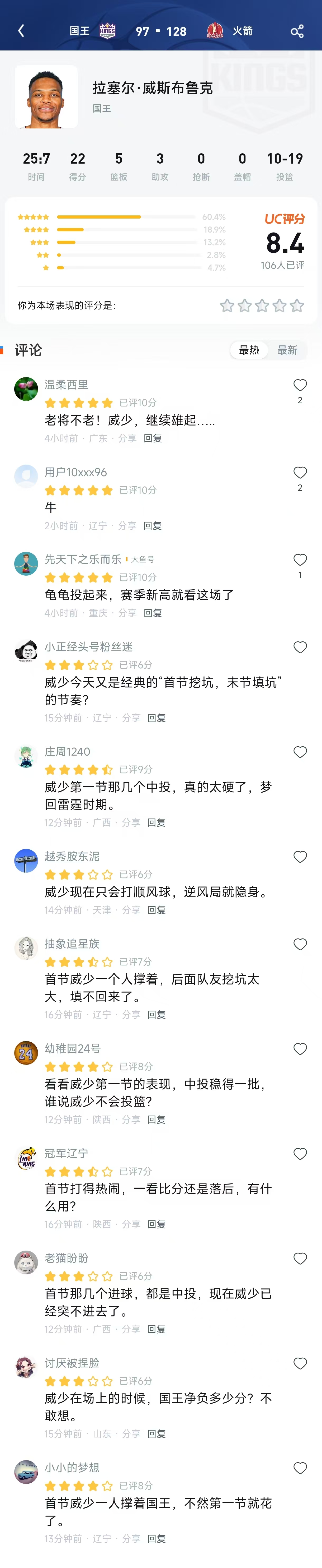 ① 原始UC评分截图(文字版) 国王 97 - 128 火箭 拉塞尔·威斯布鲁克 (国王) 时间: 25:7 | 得分: 22 | 篮板: 5 | 助攻: 3 投篮: 10-19 (52.6%) UC评分:8.4(106人已评)