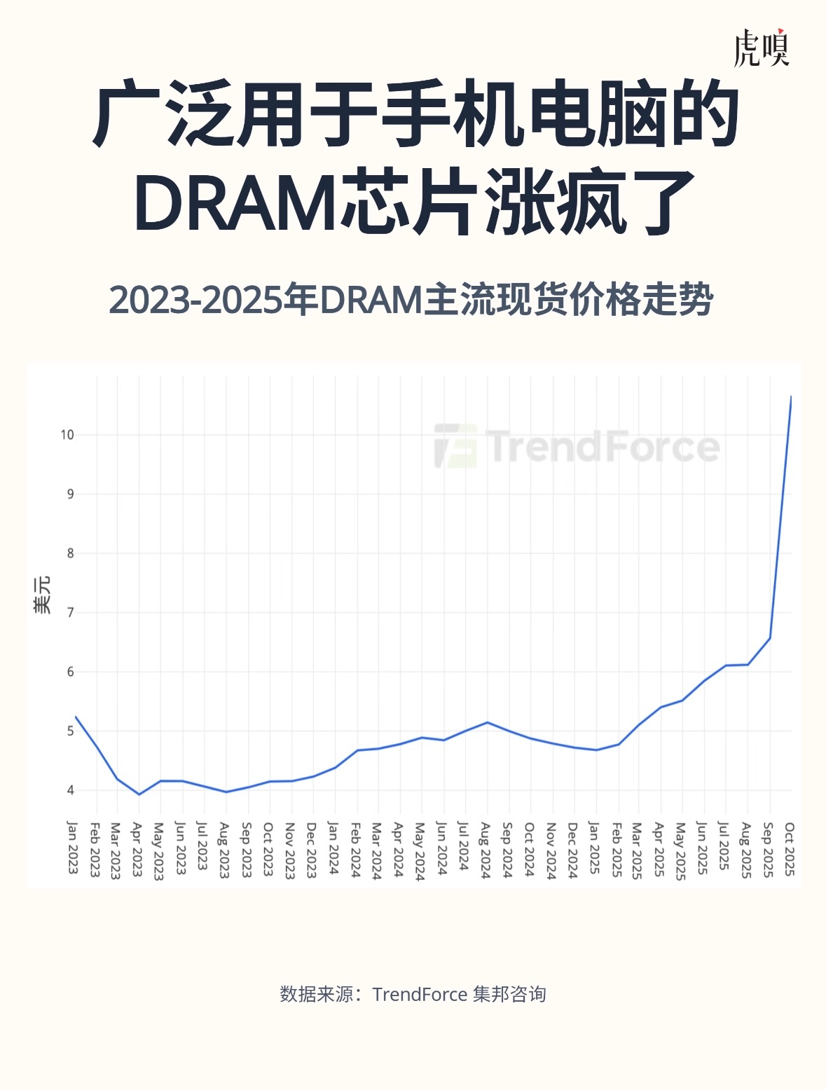 TrendForce 数据显示,2025年第四季度DRAM内存合约价同比暴涨超75%。其中主流 DDR5内存条更夸张—16GB颗粒从9月底的7.68美元直接翻倍到15.5美元,一个月涨了102%