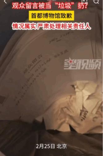 寒心了。这本被扔进垃圾桶里的留言册,最上面一页的留言日期是2026年2月24号。留言者不会想到自己真情实意的留言,没人人去看,甚至直接就会被当做垃圾一样丢进了垃圾桶里。 对此,首都博物馆发布通报称,是楼层管理员把留言册扔掉的。他们将严肃处理相关人员,以后一定加强管理,树立以观众为中心的服务理念。