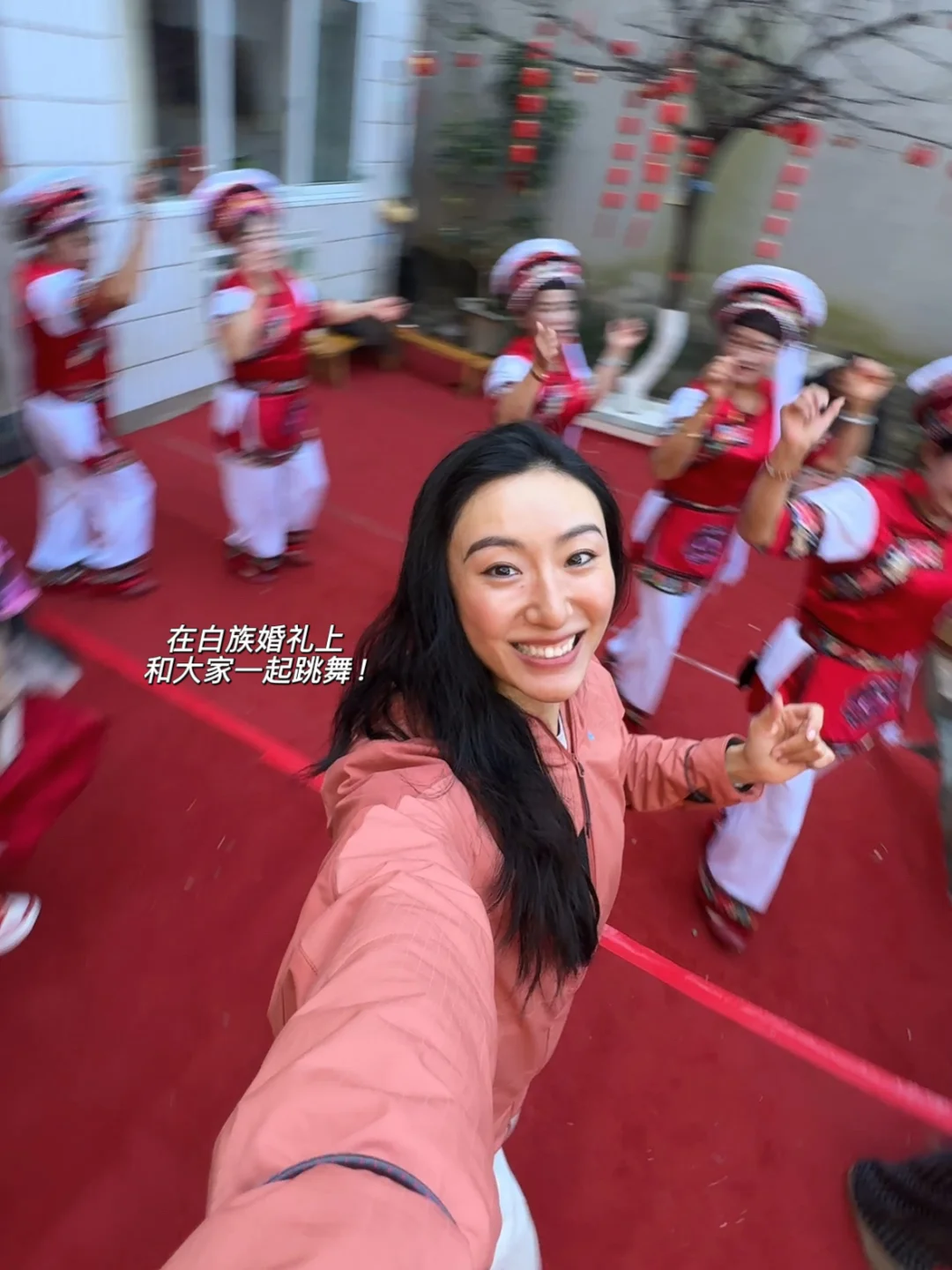 风拂柳,粉樱绽放,我身着浅粉蕾丝旗袍,立于古栏之下。长袖轻笼,盘髻缀珠,耳坠摇曳