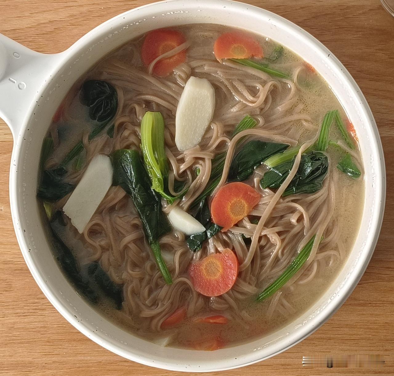 胰腺炎恢复期日常饮食分享! 荞麦面条 做法∶胡萝卜、山药切块备用,锅热放少许橄榄油或亚麻籽油,油热倒入胡萝卜山药翻炒至断生,加少许五香粉等调料,搅匀后加水,水开煮熟后下入荞麦面条,小火煮至软烂,加入焯好水的菠菜,根据个人口味加适量醋即可食用。 低脂、软烂、营养、易消化!