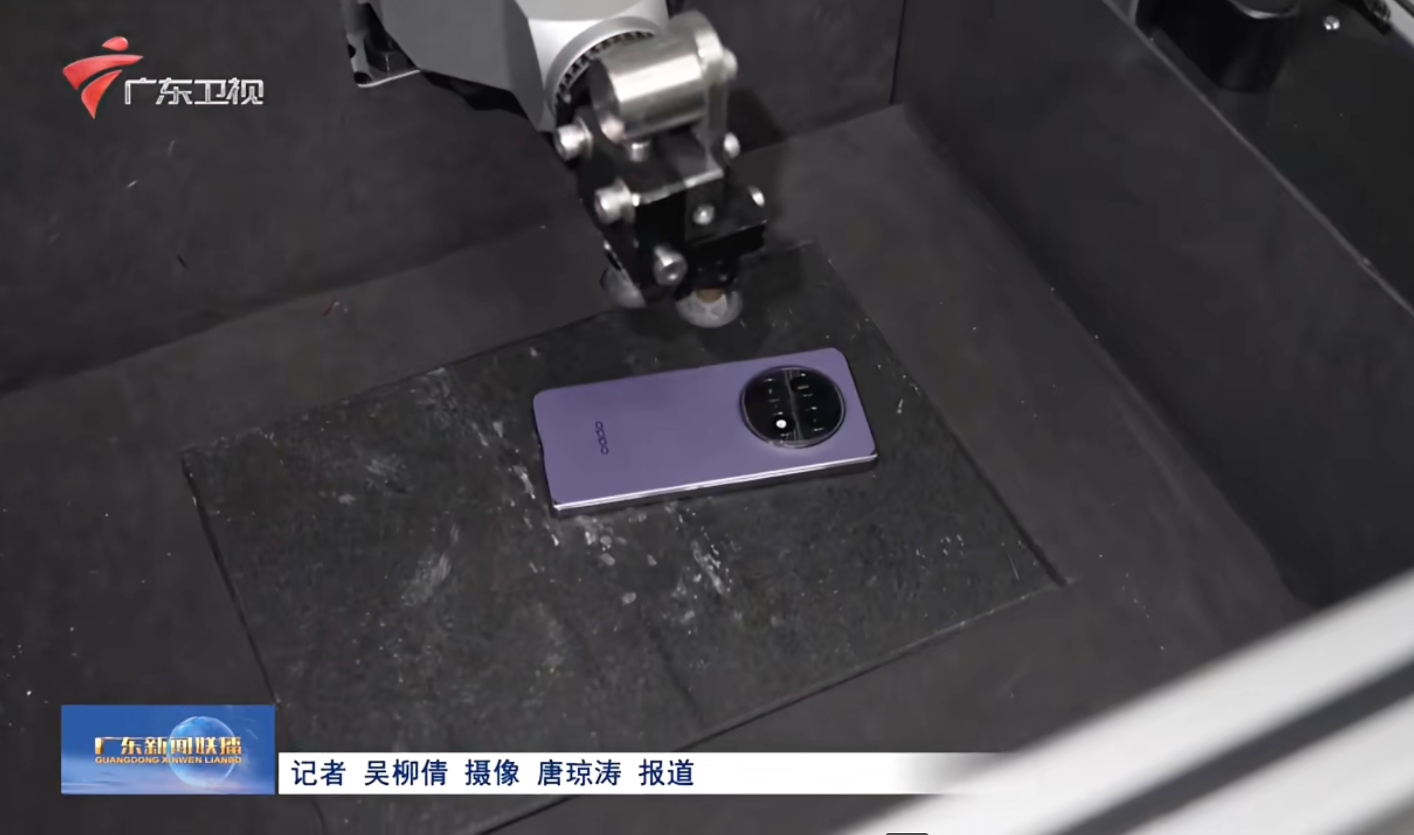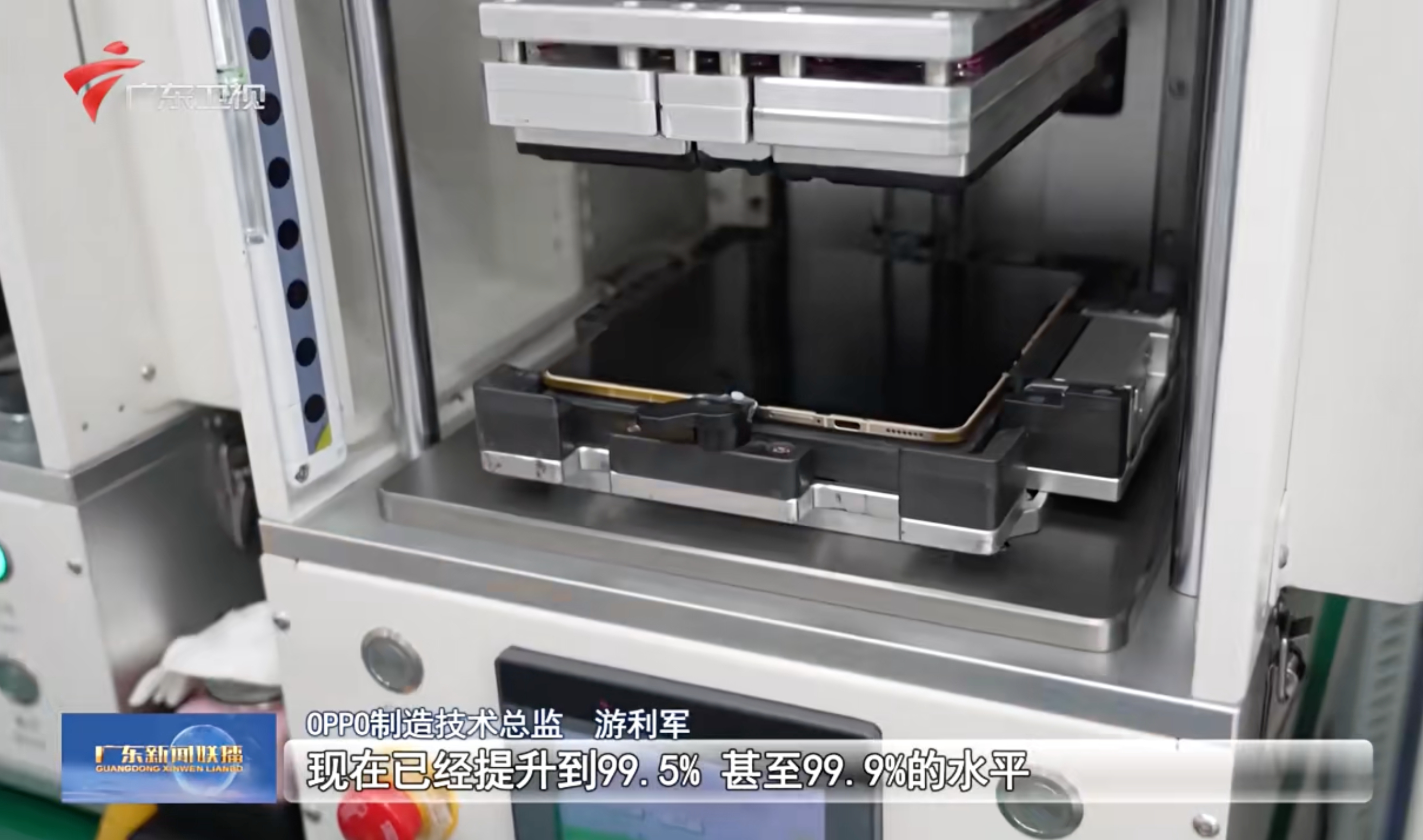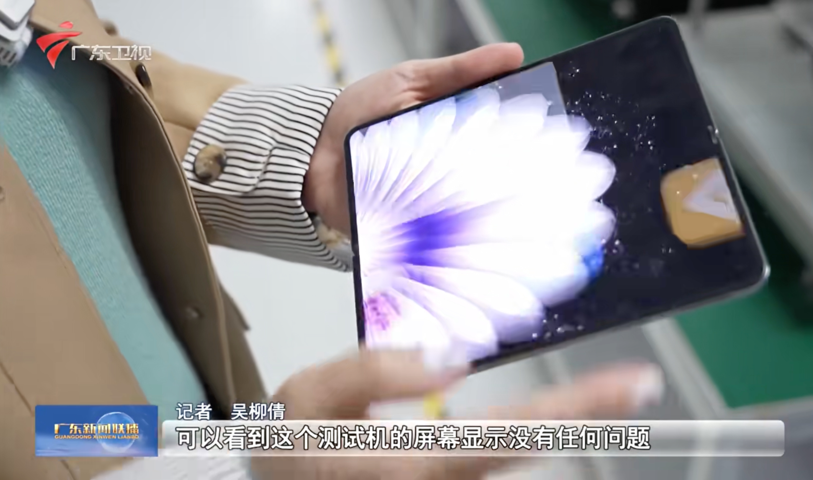 Find N6内屏正面疑似露出来了。广东卫视的探访工厂节目报道里面,产线上这台,应该就是内屏超平整的N6。确实看不到折痕,息屏状态下也是。厚度也是挺薄的。看到有黑色,还有一台是金色中框。最后出现的紫色好像还是N5的造型,不能确定是不是N6的紫色。不过记者手上亮屏的那台是紫色壁纸,如果也是N6的话,那么应该机身也有紫色的?前面几张不是N5的原因,是因为对比了下这个卡槽、C口和扬声器在右下边同一侧,N5的卡槽扬声器在左边的另外一侧。