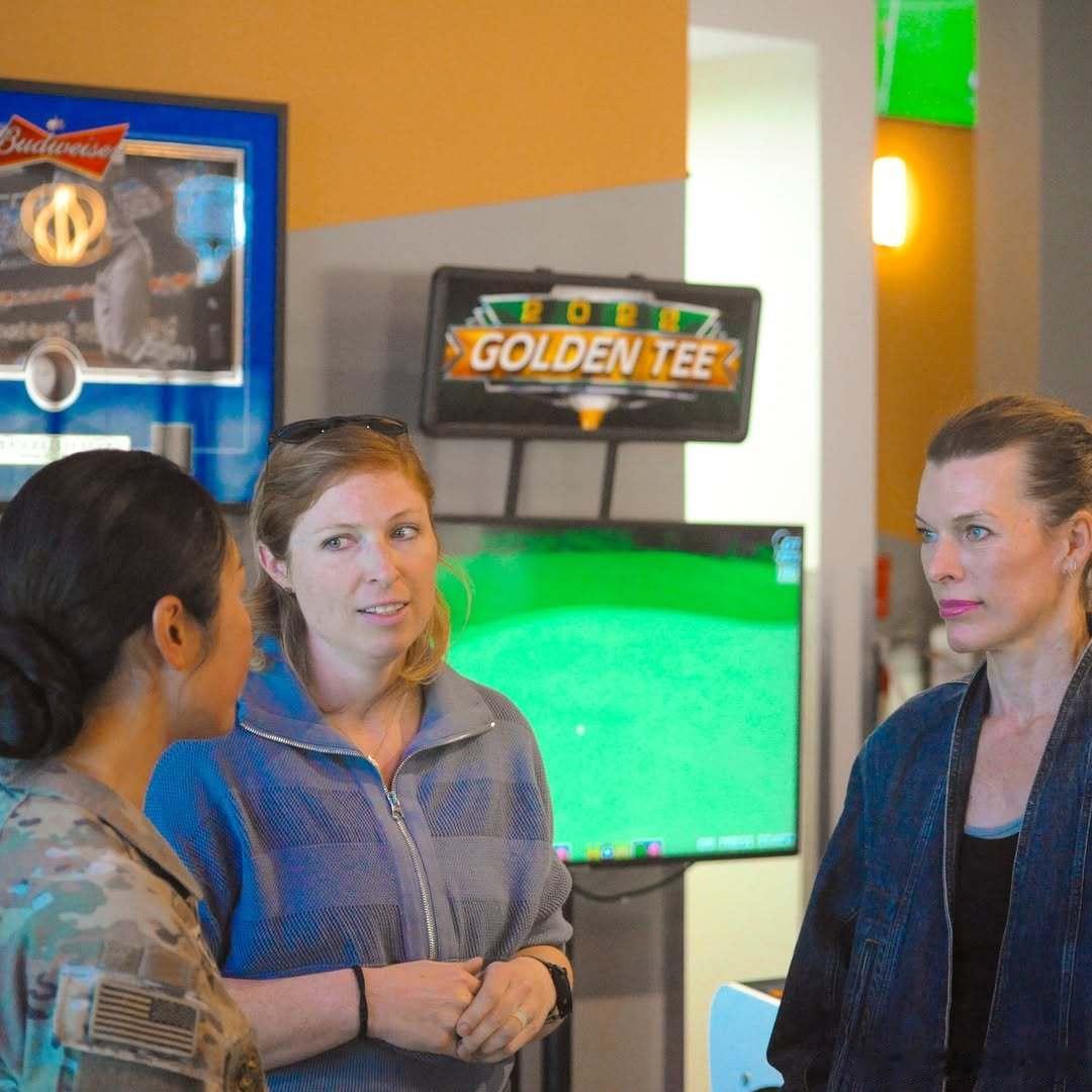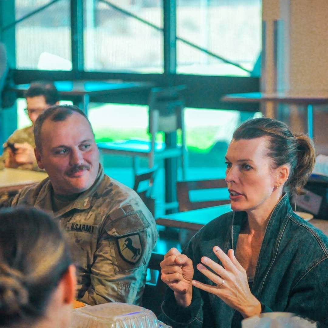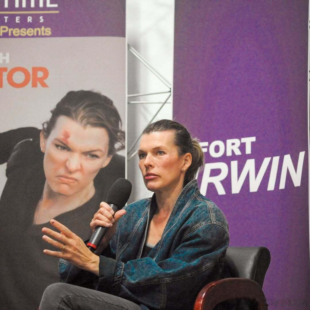 milla jovovich米拉乔沃维奇在加州欧文堡的军事基地为士兵们举办了一场主演新动作片《Protector》的放映活动,影片将于3月6日上映