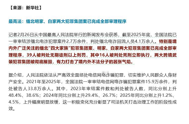 缅北白家和明家有16人被处以极刑! 白家和明家的16人已经被执行极刑,几十人判处无期徒刑和各种有期徒刑,反正这一次大规模的处理,算是大快人心。缅北徐家集团也已经审理完毕,没有人被判处极刑,只有死缓和无期徒刑以及有期徒刑。 现在就剩下缅北的魏家和刘家,没有宣判,估计是案情比较复杂,需要继续审问和调查,一步一步的来,不着急的。反正现在的缅北地区,在靠近边境的佤邦、勐拉、果敢地区。暂时是没有了网络公司,但是再往下缅甸走的区域,还是有不少网络公司在运营。 缅北地区的德昂军和果敢军,爆发了激烈冲突,就是因为果敢同盟军抓捕了一个370人的网络公司人员,交给了云南省。导致德昂军失去了不少收入,之后就爆发了激烈对峙和冲突。 还有一些网络公司,在北掸邦军地区地盘内的网络公司,陆续抓捕,现在还没有完全抓干净。这些个网络公司都是流动的,一会儿在缅北,一会下缅甸,一会又去了柬埔寨,反正就是不断流动。所以缅北地区的形势,不能有任何放松,必须要实现抓捕常态化和固定化,每隔一段时间,就得抓捕一批。 因为网络公司是抓不尽的,今天抓完这个,明天另一个又来了,反正就是像韭菜一样,取之不尽一样。但是现在执行了这么大的措施,还是有网络公司在不断的运行,可见高利润之下,真的有人不怕法律的制裁,必须要抓不到最后,绝不放松。 路漫漫其修远兮,吾将上下而求索,斗争不会停下。