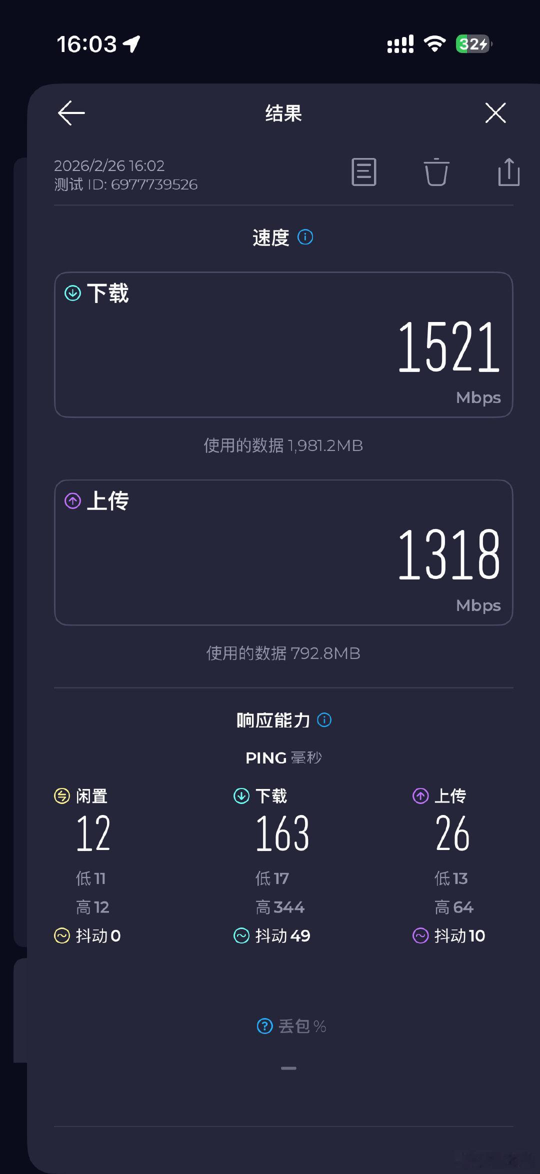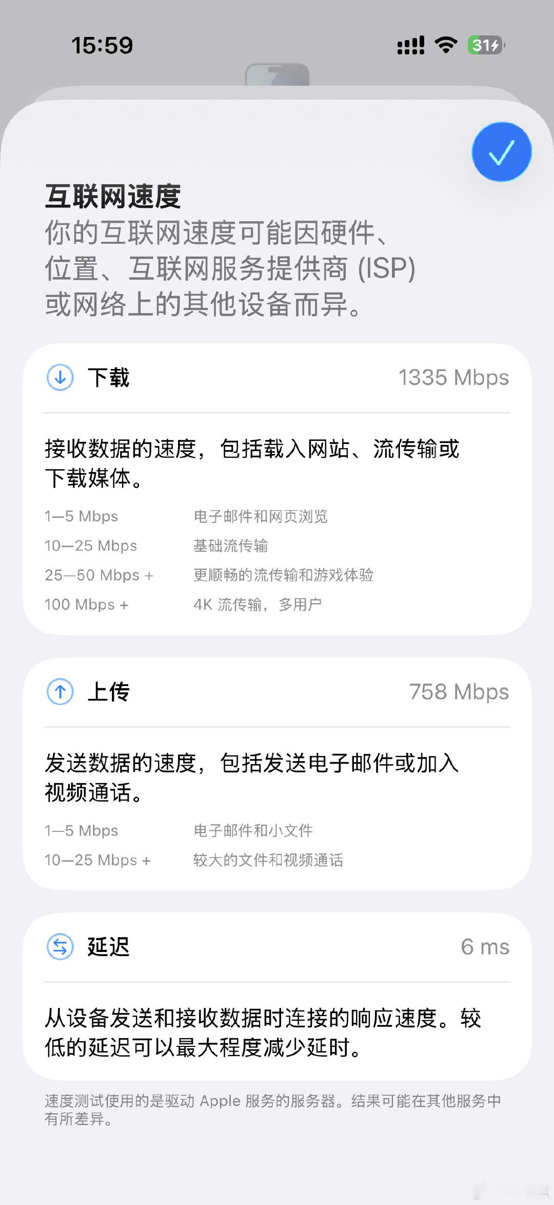 iPhone能测网速了 试了一下,还挺好用的。下载速度基本和 Speedtest 测出来一致,都在 1500Mbps 左右。但上传差异就明显了,Speedtest 测到大约 1300Mbps,而苹果官方只给到 700 多 Mbps,差了一半。估计苹果的测试方法偏保守。