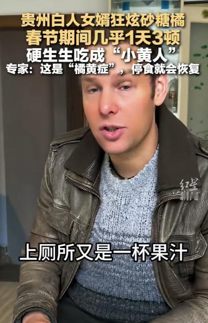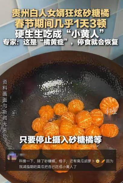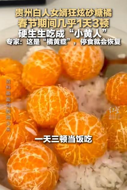 “开眼界了!”近日,贵州,一外国男子陪妻子回娘家过年,吃了砂糖橘后便疯狂爱上,之后更是一天三顿当饭吃,没想到一个月后,男子的皮肤迅速变黄,硬生生把自己吃成了“小黄人!”。专家:影响颜值,但不影响健康! 春节向来是各类水果集中消费的高峰期,而砂糖橘绝对是年货水果里的人气王者。 相关数据显示,每年春节假期前后,全国砂糖橘的市场消费量能轻松突破百万吨,南方地区的家庭茶几上,砂糖橘的摆放占比更是超过 90%。 普通家庭整个春节期间,平均能消耗 5 到 10 公斤砂糖橘。 这种个头小巧、果皮轻薄易剥、果肉无渣多汁的柑橘类水果,凭借甜而不腻的口感,成了男女老少都无法拒绝的春节零食。 这位第一次在国内过春节的外国男子,自然也没能抵挡住这份美味的诱惑。 在此之前,他很少有机会吃到这样新鲜甜美的小型柑橘,第一次尝到时就被独特的风味吸引,原本只是随手吃几颗当作零食,没想到越吃越上瘾,慢慢变成了离不开砂糖橘的状态。 在娘家的日子里,他几乎把砂糖橘当成了日常饮食的一部分,早上起床后会先吃一盘开胃,中午吃完饭立刻端起砂糖橘解腻,晚上和家人围坐聊天、看电视时,手里更是全程捧着砂糖橘不停嘴,一天三顿都少不了它的身影。 家人看到他如此喜爱中国的水果,还特意多准备了几箱放在家里,任由他尽情享用,谁也没有想到,这样持续吃了一个月后,会出现让人意外的变化。 最先发现异常的是他的妻子,某天近距离相处时,她突然发现丈夫的皮肤颜色和之前不一样了,原本白皙的皮肤渐渐透出一层淡淡的橘黄色。 尤其是手掌、脚底这些角质层较厚的部位,颜色变得格外明显,连脸颊和鼻尖也泛着均匀的黄色,整个人看起来就像被天然色素轻轻染过一样。 一开始家人都有些担心,害怕是水土不服或是身体内部出现了问题,毕竟肤色突然发生明显改变,任谁都会心里不安,于是赶紧带着他前往医院做详细检查。 医生在了解了他的日常饮食和生活习惯后,又结合了各项检查结果,很快就给出了明确的答案,让所有人悬着的心都放了下来。 男子的身体各项指标都完全正常,肝功能没有任何损伤,也没有出现任何不适症状,皮肤变黄并不是疾病导致的,而是短时间内大量食用砂糖橘引发的橘黄症,医学上也称作高胡萝卜素血症。 有临床数据统计,每年春节前后的一到两个月,医院接诊的橘黄症患者,会比平时增加 30% 到 40%,这类案例在生活中其实并不少见。 砂糖橘的营养成分数据显示,每 100 克砂糖橘中,β- 胡萝卜素含量约 1.2 毫克,这种物质是对人体有益的营养成分,也是合成维生素 A 的重要原料。 但人体肝脏对胡萝卜素的代谢能力有限,短期内摄入过量,多余的胡萝卜素无法及时转化代谢,就会随着血液流动,沉积在皮肤的角质层和黏膜组织中,进而让皮肤呈现出均匀的黄染,这就是橘黄症的形成原理。 砂糖橘作为春节水果界的 “顶流”,凭借易剥、清甜、便携的优势,成为家家户户过年的必备零食,也正是因为它太过美味,很容易让人在不知不觉中过量食用,这也是每年春节前后,橘黄症相关案例会小幅增加的原因。 其实适量吃砂糖橘对身体有不少好处,它能补充维生素 C、膳食纤维等营养,清甜的口感还能缓解节日里油腻饮食带来的不适感,每天吃三到五颗,既能享受美味,又能满足身体的营养需求,完全不会给身体带来负担。 如今这位外国男子已经按照医生的建议,调整了自己的饮食,不再大量食用砂糖橘,他的肤色也在慢慢恢复原本的样子。 这段因为砂糖橘引发的可爱经历,不仅成为他和家人之间难忘的春节回忆,也让大家在欢声笑语中,记住了这个关于美食与健康的小知识,也感受到了中国年味里独有的甜蜜与温暖。 对于这件事,您有什么想说的吗?欢迎评论区留言讨论。 信源:红星新闻2026-02-25——《贵州白人女婿狂炫砂糖橘,春节期间几乎1天3顿硬生生吃成"小黄人”,专家:这是"橘黄症”,停食……》