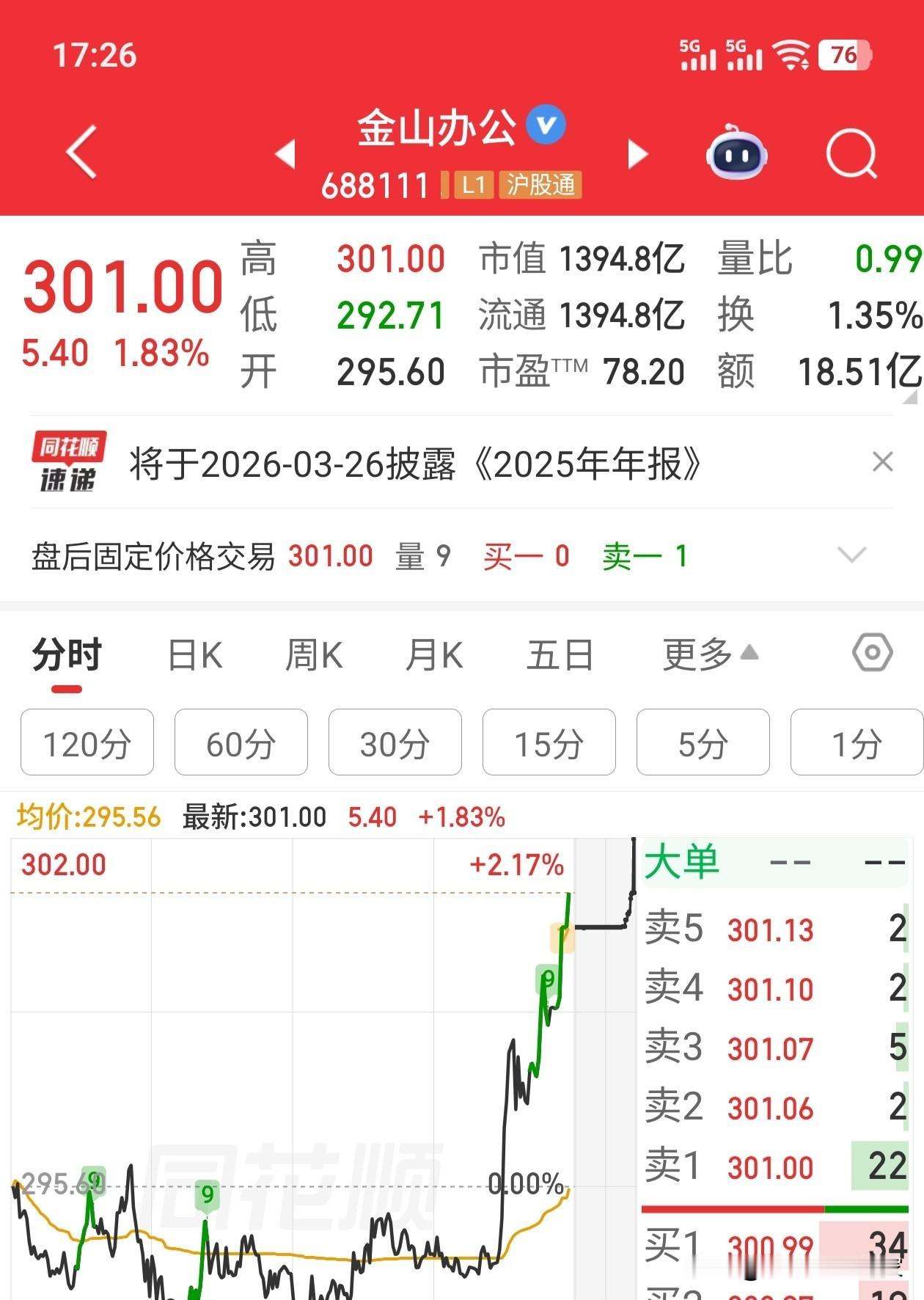 金山办公!!!这是发生了什么了吗?尾盘最后半个小时,出现了神奇两点半行情,将近拉了2.5%上来。大资金从上午的净流出2亿,到尾盘收盘居然流入5000万,太厉害了,我翻遍了全网,似乎没有啥重大利好啊,难道就是拉尾盘,非奸即盗?让我开心好一会,估计明天又是凶多吉少了。又有多少人是在今天最低点给割肉的?