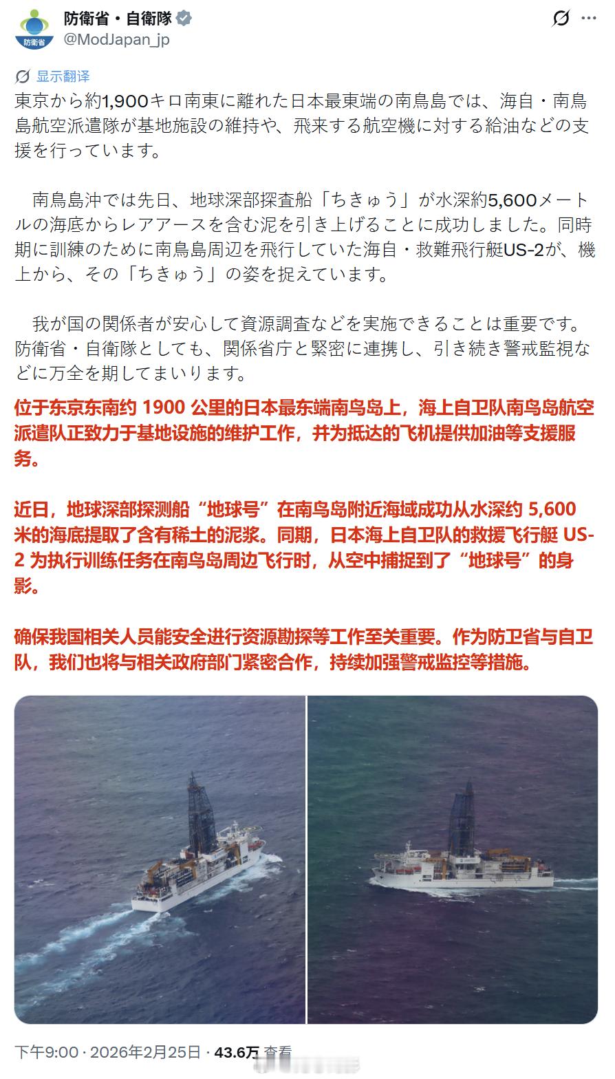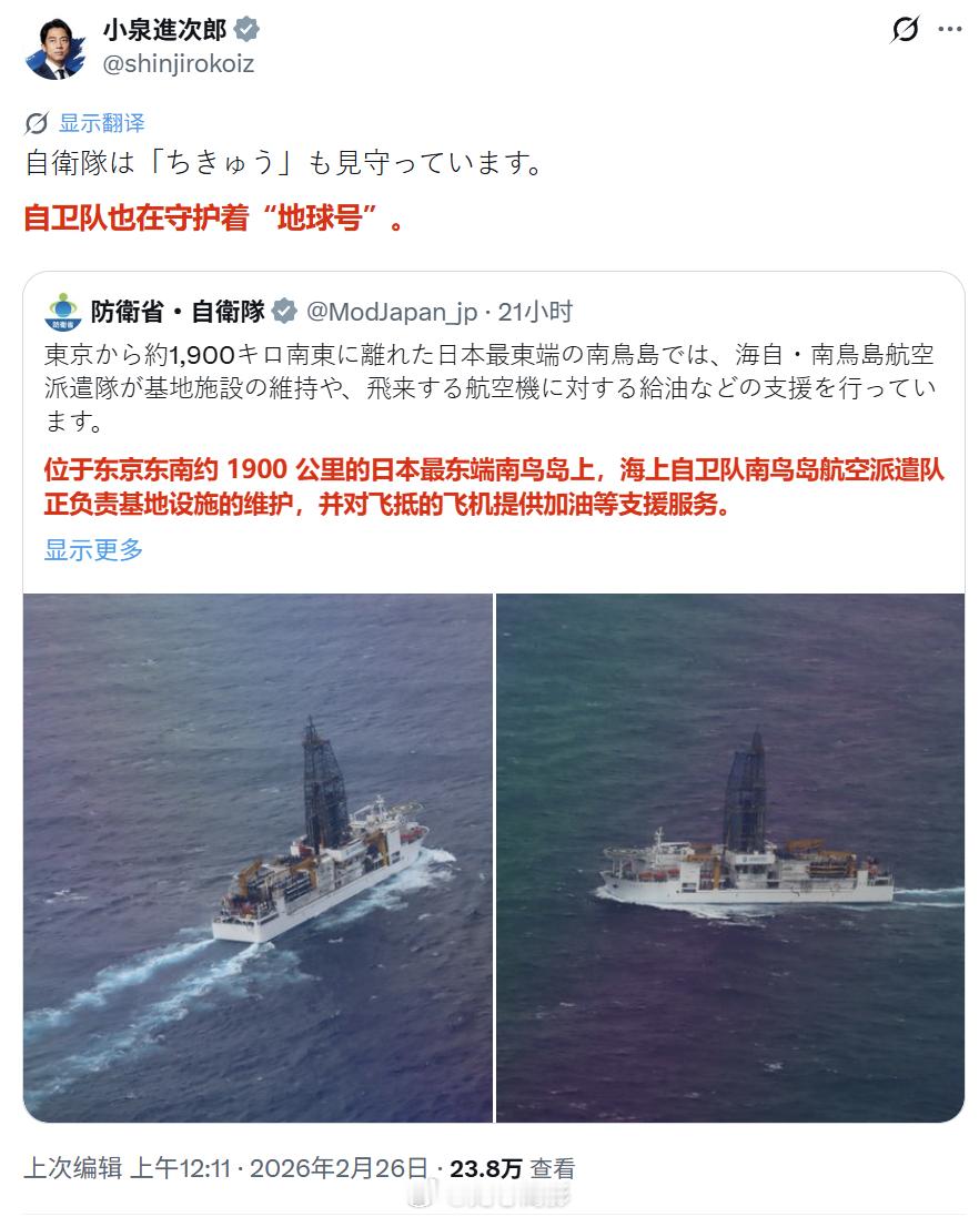 日本自卫队以及日本防卫大臣小泉进次郎发帖,表示“自卫队守卫日本开采南岛稀土”。评论区居然有人表示要防着中国……外媒也发文称“日本方面一直担心中国方面会干扰日本方面的稀土开采”。不是哥们,你们真觉得中国会拦着你们去挖海底6公里的泥浆子吗?