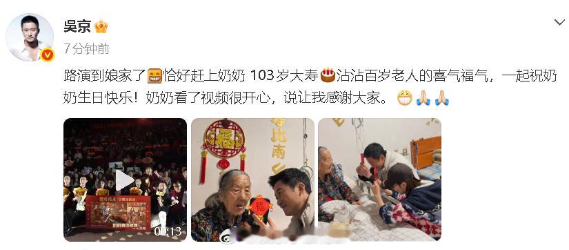 吴京给谢楠奶奶庆103岁生日 吴京《镖人》路演到合肥,刚好赶上谢楠奶奶103岁生日,和主创&观众为奶奶庆生:“路演到娘家了恰好赶上奶奶 103岁大寿沾沾百岁老人的喜气福气,一起祝奶奶生日快乐!奶奶看了视频很开心,说让我感谢大家。”