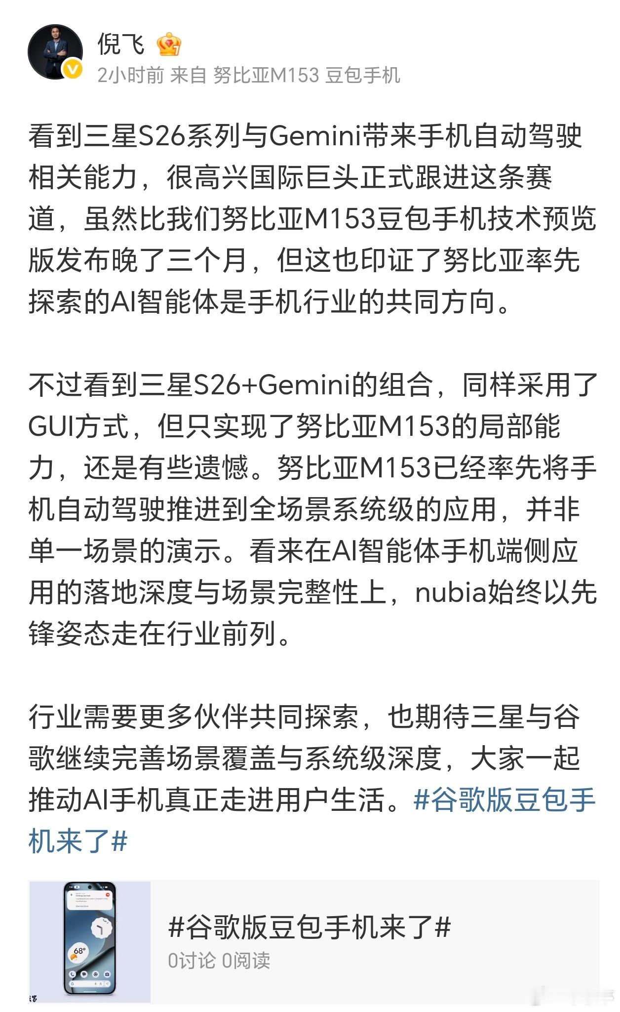 高管称S26只实现豆包手机局部能力看完飞总回应,手机AI智能体赛道这下彻底明朗了。三星+Gemini终于下场做“手机自动驾驶”,看似重磅,其实是努比亚三个月前就走完的路。同样是GUI交互,努比亚M153直接做到全场景系统级落地,而S26目前更像单场景演示,深度和完整性差了一截。这不是小差距,是“能用”和“好用”的分水岭。AI手机拼的不是堆参数,是谁先把端侧智能体真正交给用户。国际巨头跟进,恰恰证明努比亚踩准了行业未来。竞争越卷,用户越受益,期待各家把AI手机从概念变成日常刚需。努比亚总裁倪飞回应谷歌版豆包手机