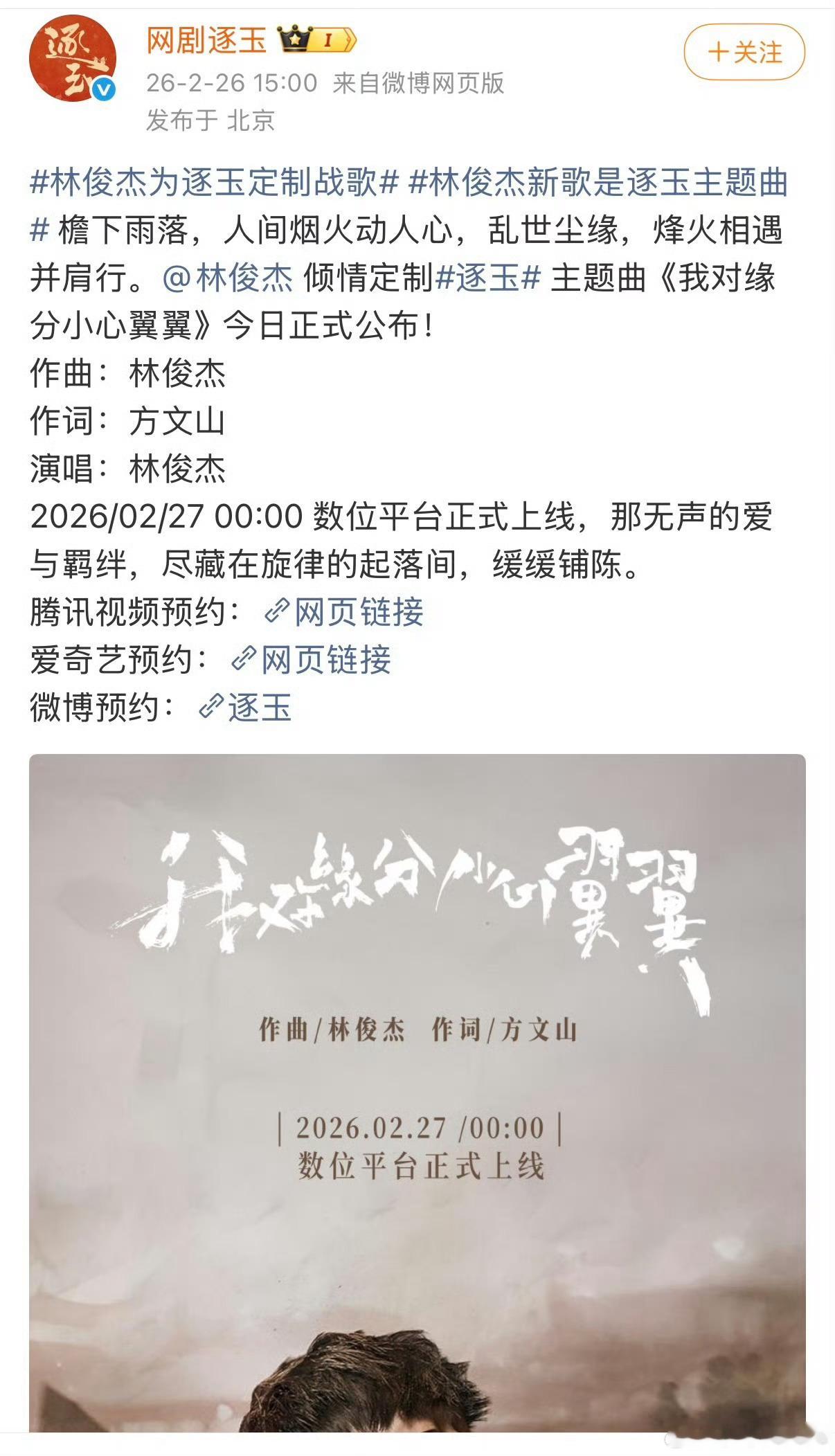 林俊杰作曲方文山作词这个逐玉是真的要来了!大手笔啊!ost找的林俊杰方文山!