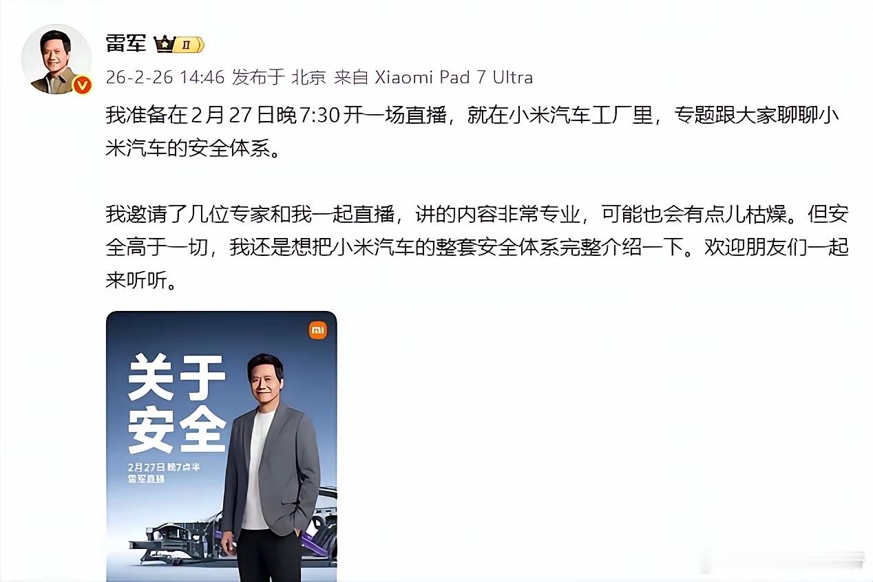 雷军又要直播了,这次是讲小米汽车的安全体系!