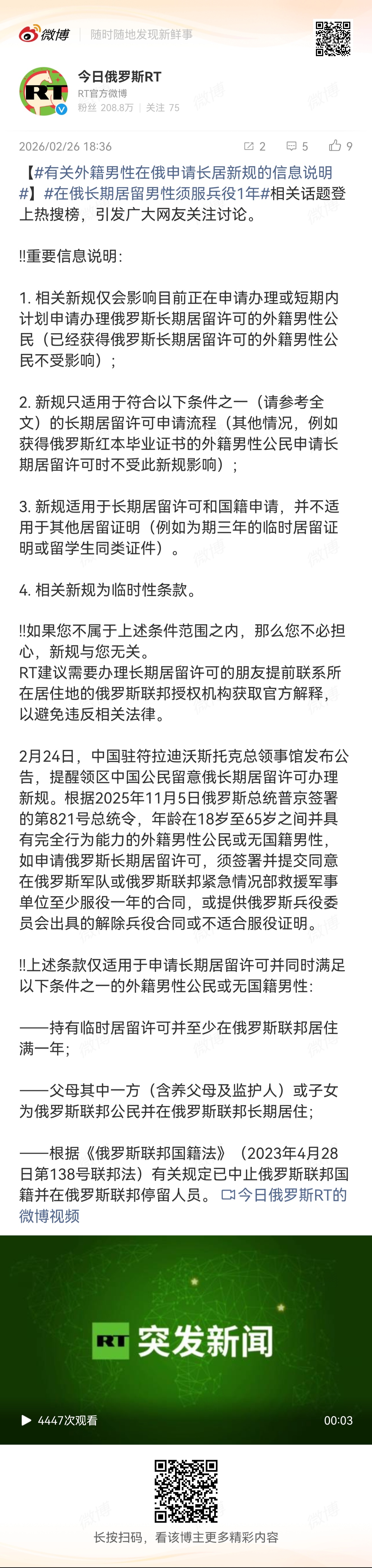 今天,#在俄长期居留男性须服兵役1年# 登上热搜,引发关注。