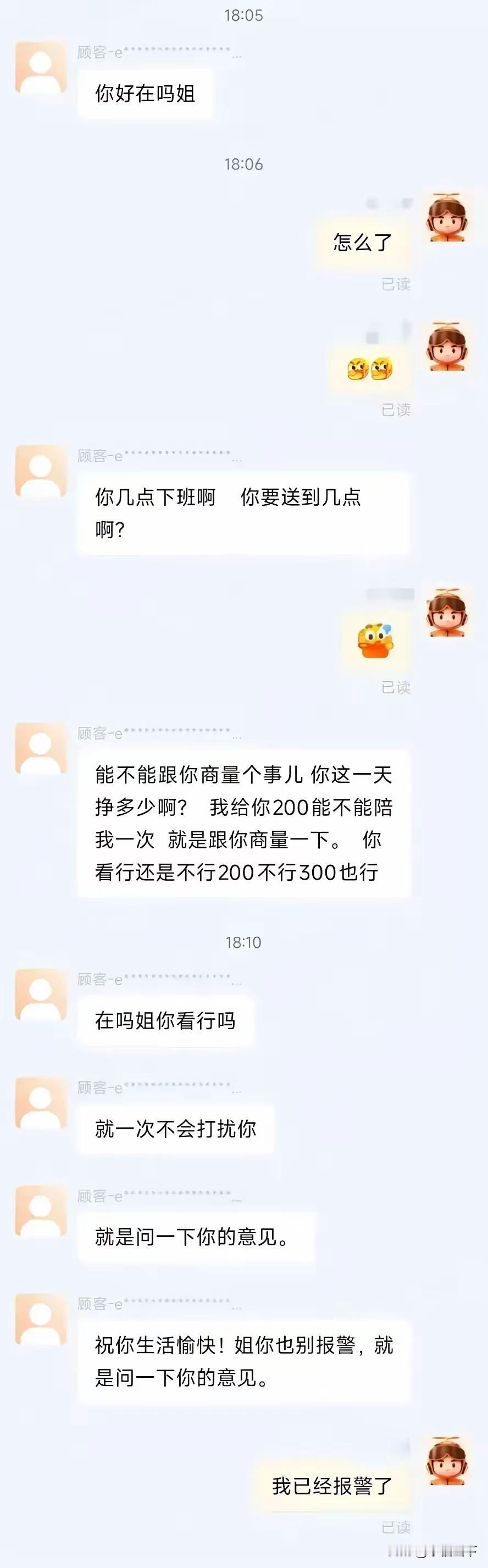 【200元买陪伴?骑手遭疯狂骚扰,报警结局太意外!】上海一位00后女骑手,辛辛苦苦爬五楼送餐,就因为长得漂亮,竟被20多岁的男顾客当成了可以用钱收买的人,说出来都让人膈应! 这位小姑娘,和很多努力打拼的00后一样,风里来雨里去,靠自己的双手跑单挣钱,不偷不抢,凭本事吃饭,本该被尊重,可她怎么也没想到,送完餐转身离开,手机就开始疯狂响个不停。 男顾客先是发消息问她一天能挣多少钱,语气里全是轻蔑,紧接着就抛出了离谱的要求:出200块换她“陪伴”一次,见她不回复,又赶紧加价到300,一副“有钱就能为所欲为”的嘴脸。短短半小时,他竟然发了57条消息,轰炸式的骚扰让小姑娘心烦意乱,骑车送下一单时,分神差点被车撞,现在想起来都让人后怕! 小姑娘彻底被惹毛了,送完手里的订单,第一时间就报了警。她当着警察的面明确说:我一分赔偿都不要,我就希望这个没底线的男人受到惩罚,让他知道,女孩子靠自己挣钱不丢人,不是他能用钱随便侮辱的! 谁能想到,结果竟然出乎意料!民警联系上男顾客后,大家才知道,这个嚣张的男人,竟然也是个00后,还和女骑手是同乡 。面对民警的批评教育,他终于怂了,当场诚恳道歉,还主动提出赔偿300元,弥补给小姑娘带来的困扰和耽误的跑单时间。 小姑娘最后收下了这300块,她说:不是我贪钱,是他做错了事,不能零成本就摆平,我要让他记住这个教训。 说真的,同为00后,有人靠双手踏实打拼,有人却拿着钱肆意践踏别人的尊严,太讽刺了!新修订的治安管理法早就明确,多次发送骚扰信息干扰他人正常生活,是要被处罚的,这个男生没被拘留,已经是从轻处理了。 外卖骑手挣的都是辛苦钱,不分男女,都值得被尊重。希望所有女生遇到这种骚扰,都能像这位小姑娘一样,不忍气吞声,勇敢站出来维权!你们觉得这个结果解气吗?换做是你,会收下这300元赔偿吗?评论区说说你的看法!