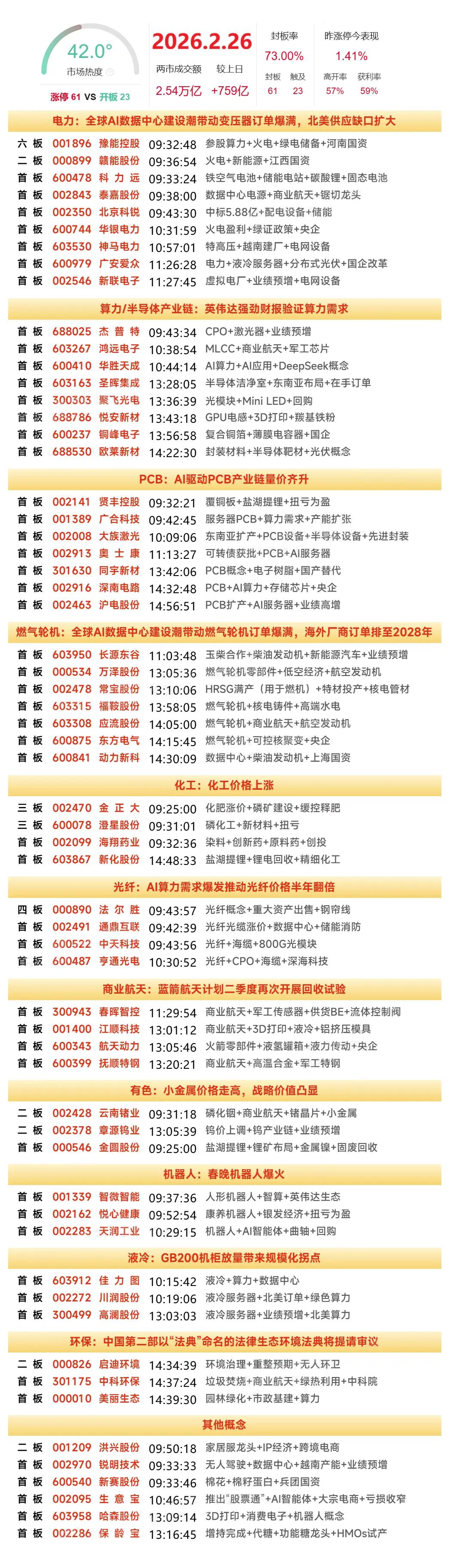 2月26日复盘:华胜天成、中天科技、云南锗业、豫能控股、澄星股份隔日走势的一些看法! 1、华胜天成(AI算力) 今天市场算力方向修复明显,华胜在低开后走出趋势上涨,在临近11点出现资金强势拉升上板,封板资金一度达到35亿,最终稳稳封死涨停,走出了4天2板的强势表现! 盘后的龙虎榜紫阳东路、知春路、万豪世家和江苏路这些短炒游资都是大幅买入,卖盘多为量化,这是比较明显的良性换手,从华胜的趋势看,整体还是非常不错的,春节前最后一个交易日走出了突破首板,但是年后在大幅高开后毫无抵抗走出兑现表现,昨天出现止跌修复后,今天在板块强势的情况下出现强势反包,隔日冲高期货大概率的,而且今天整个算力方向是有非常强的板块效应的,隔日继续强势表现的概率非常大,而华胜的辨识度非常高,隔日开盘如果有明显抢筹,是很可能被资金做成连板的,但是考虑到近期市场轮动加剧,华胜会不会出现资金承接很难说,所以对于这只个股来说,开盘如果真强势,也许确定性的去做打板或许性价比更高,毕竟这只个股从情绪上看,趋势还在,虽然短炒资金会做套利,但是只要趋势不错,它这一波可能会还有高度! 2、中天科技(光纤) 盘前光纤方向有利好,AI算力需求爆发推动光纤价格半年翻倍,所以开盘后昨天烂板的法尔胜迅速出现资金抢筹到近红盘开,开盘后快速出现资金做多拉升涨停,而大幅高开的中天也是迅速出现资金承接封死涨停,走出了一个高位的缩量板! 中天在之前是明显的趋势上涨,这个高位的涨停确实有加速的感觉,但是这只个股毕竟流通市值比较大,想要连板在现阶段市场环境下其实非常困难,而且现阶段的市场是喜欢做大屁股的首板的,但是如果没有特别强的板块效应,隔日多数时候是直接断板的,所以中天隔日得看点更多的是能不能维持住趋势,毕竟这种大屁股,在高位如果趋势不坏的话,其实是还有上行空间的,比如周二涨停的华中、虽然断板了,但是整体趋势依然非常好,所以对于中天来说,只要光纤的行情能够反复,中天短期内的趋势表现值得关注! 3、云南锗业(有色金属) 今天早盘稀土方向是明显偏弱的,但是云锗却是近涨停板高开,这是非常强势的,所以开盘在顶住分歧后很快出现资金拉升涨停,之后再也没有出现炸板,走出了比较强势的二连板形态! 盘后的龙虎榜买盘多为隐藏游资席位,卖盘成都系和章盟主两个游资兑现离场,3日榜中可以看到成都系还有超7千万筹码格局,整体算是一个非常良性换手的榜单,从情绪上看,云锗整体走出持续性的概率其实非常低的,而连续两个涨停都是大幅高开后的分歧晋级,隔日就要有更强的预期,不开一字板的话兑现概率就非常大,毕竟整个有色的持续行情会很难,所以对于云锗来说,接下来追涨的接力已经不可取了! 4、豫能控股(电力) 早盘竞价豫能超预期抢筹到红盘开,而昨天更强的汉缆反而低开,个股强弱是有明显逆转的,再加上电力方向今天强势修复,豫能开盘迅速出现资金抢筹封板,虽然在板上出现了一次分歧,但是回封后很快彻底封死涨停! 豫能今天的强势表现更多的是因为电力方向的强势表现,而很明显的一点是偏电网设备的汉缆反而更弱,再加上它算是短线情绪明显的一次突破,所以隔日得看点是非常足的,毕竟一旦隔日收盘涨幅超3个点必然触发严重异动,这是主板个股已经很久没有挑战过的门坎,它是选择控异动后上涨,还是直接去强势触发会是短线最大的看点,毕竟近期短线情绪非常差,如果它能主动亮剑,或许会为持续低迷的短线环境注入一丝活力,毕竟从今天的涨停形态看,隔日得预期是非常高的,一旦竞价大幅高开,并且能迅速出现资金承接封板,它就会是这次短线行情典型的破局龙! 5、澄星股份(磷化工) 磷化工方向竞价整体其实是非常亮眼的,澄星虽然竞价成交量超过了1亿,但是相比于昨天一字板的总量能来说还是明显缩量的,说明资金做多情绪还是比较强的,再加上金正大大单一字,所以整个磷化工虽然有分歧,但是前排的表现还是非常有看点的,所以开盘后虽然六国、和邦都是高开兑现,但是澄星在开板后是有明显资金承接的,并且很快出现彻底回封,走出了一个非常强势的T字放量换手板晋级! 盘后的龙虎榜章盟主为首的短线游资占据了买盘,卖盘为短线获利资金兑现,这是一个典型的良性换手榜单,再加上磷化工今天虽然整体有回调,但是板块依然有金正大和澄星两只晋级,而且云天化这只趋势中军的表现并不差,这个方向和电力算是当前市场最可能走出持续性的,所以澄星隔日和金正大的竞争必然会持续,一旦磷化工方向出现修复,这两只个股大概率依然会有强势晋级的,所以隔日澄星开盘的表现还是非常有看点的! 本文只限于分享和交流,不构成投资建议,股市有风险,投资需谨慎!