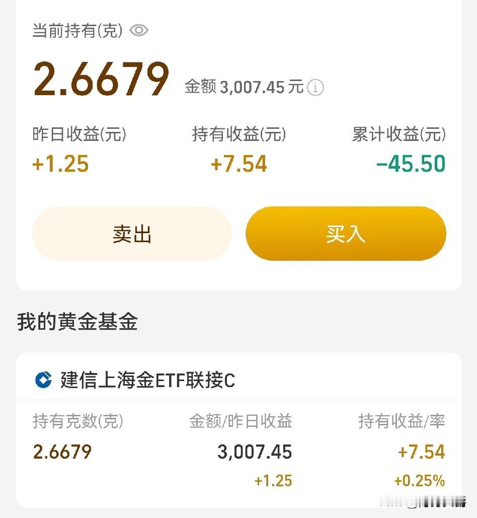 我这3000黄金基金, 追涨买入,入手第三天就赚了153块。 当时我觉得还没赚够,等7天之后免一大半手续费再说,跌了还会涨,机会多的是。 谁知道错过那个村就没了那个店,第四天一个大跳水,再也没回到那个位置。 今天的收益还没结算,貌似微跌进去10块钱。 已经横盘几天了,明天应该会涨,明天如果涨2%以上,就出掉一半。 中美贸易已经回稳,这是世界稳定的一大因素,黄金应该不会再涨了,有机会保本出局就是万幸。