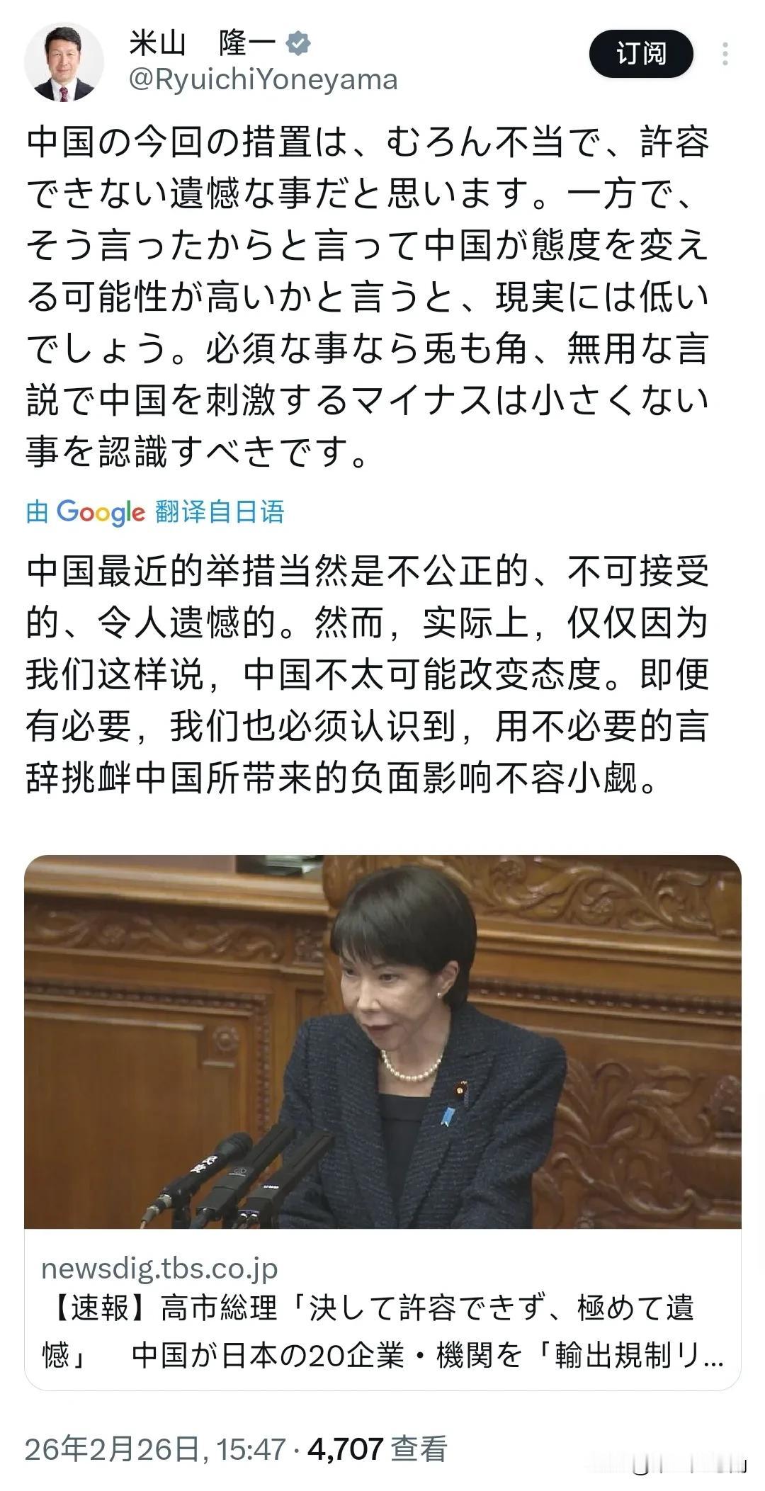 日本众议员、前新潟县知事米山隆一今天(2月26日)写道:“我认为中国此次的举措无疑是不当的,也是令人遗憾、无法接受的。但另一方面,即便如此表态,中国改变立场的可能性在现实中想必也很低。我们理应认识到,若是必要的表态倒也罢了,用不必要的言辞挑衅中国所带来的负面影响不容小觑。” 评几句 米山隆一的言论呈现出一个典型的日本政治人物"两面性"话术结构:先完成"政治正确"的表态义务——认定中国举措"不当""遗憾""无法接受",再迅速转入现实主义的冷静分析。这种"先骂后劝"的修辞策略,本质上是在日本国内对华强硬舆论场中为自己保留理性发声空间的生存技巧。 这种"安全区"操作本身即暴露了日本外交话语的深层困境:当"必要的表态"已成为政治必修课,理性声音反而需要以"即便如此"作为前置条件才能出场。这不禁令人质疑——当批评必须包裹在自我审查的语境中,其真实效力还剩几何? 米山真正想传递的信息藏在后半句:"用不必要的言辞挑衅中国所带来的负面影响不容小觑。"这是在对当前日本对华政策敲响警钟,尤其指向近期高市早苗政府在台海、历史等问题上的高调姿态。 米山将中国的出口管制措施定义为"不当",却将日本的强硬回应称为"不必要的言辞挑衅"——这种不对称的归因逻辑,暗示其内心深处或许并不认为当前事态全是中方的责任,只是碍于身份无法明说。这种"欲言又止"的批评,恰恰反映了日本政坛知华派在"政治正确"高压下的表达焦虑。 作为前新潟县知事,米山的表态带有鲜明的地方经济治理者底色。新潟作为日本海侧重要港口城市,对华经贸联系紧密,且直接面对日本海油气开发等敏感议题。米山深知,外交辞令的"硬度"与地方经济的"温度"之间存在直接换算关系——每一句"不必要的挑衅",都可能转化为港口贸易量的实际损失。 米山的言论虽显理性,但仍未跳出"受害者叙事"框架——将中国的措施预设为"不当"前提,而非追问其政策动因与历史脉络。真正的外交智慧,应当敢于质疑"表态是否真有必要",而非仅仅计算"挑衅的成本"。当"必要的表态"本身成为激化矛盾的源头,沉默或许比正确的废话更具建设性。