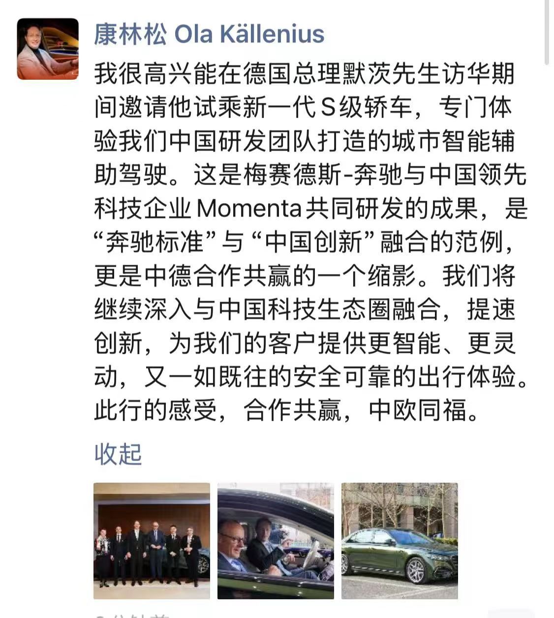 提前大爆料!今天的奔驰全球总裁的朋友圈!4月北京车展即将登场的新款S级轿车,康林松先生已经率先请来华访问的德国总理试乘上了,体验一把“在地融合创新”的成果~城市NOA辅助驾驶。不过还想多说一句,像Momenta这样的科技企业国内有一大批...百家车坛