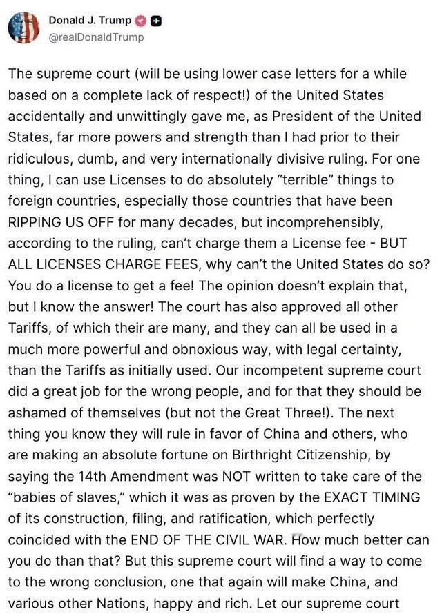 特朗普社交媒体发文,又拿中国说事!直接火力全开,怒怼美国最高法院,嫌判决又蠢又离谱,还公开表示“不配拥有大写尊称”。嘴上骂得狠,转头却乐开花,声称法院反而送他更大权力,能更凶地对华等国挥舞关税大棒。他还吐槽最高法院偏心,说判决会让中国等国“发财躺赢”,只猛夸三位站自己这边的大法官,全程情绪拉满 2026年2月20日,美国最高法院以6比3的票数作出裁决,认定特朗普政府援引1977年《国际紧急经济权力法》对全球多国加征的关税措施越权,宣布这些关税无效。多数意见由首席大法官约翰·罗伯茨撰写,得到三位自由派大法官索托马约尔、卡根、杰克逊,以及保守派中的尼尔·戈萨奇和艾米·科尼·巴雷特支持。三位保守派大法官克拉伦斯·托马斯、塞缪尔·阿利托和布雷特·卡瓦诺提出异议,认为总统在贸易紧急状态下有更大权限。 判决一出,特朗普当天就在Truth Social上连发多条帖子,火力全开。他先把法院批成“ridiculous and dumb”,说这个决定“stupid beyond belief”,还公开表示最高法院不配用大写字母尊称,以后只写小写“supreme court”来表达轻蔑。他直接点名多数派大法官偏心,称这个裁决等于让中国和其他贸易伙伴“躺赢发财”,因为没了这些关税,美国继续吃亏,对手照样占便宜。他反复强调,法院多数意见就是在帮外国企业,损害美国工人和制造业。 骂完一通后,特朗普话锋一转,开始说这个判决其实是“天上掉馅饼”。他声称法院反而给了他更大权力和更强的法律工具,现在可以用其他途径把关税玩得更狠。他特别提到1974年贸易法第122条款,这个条款允许总统在国际收支失衡时对进口商品加征最高15%的临时关税,期限150天,而且不需要国会批准。他在帖子里写得明明白白:现有其他关税类别法院都认可了,现在可以用更确定、更强势的方式执行,对那些长期“剥削”美国的国家下更重的手。他把中国列在首位,说能更凶地挥舞关税大棒,让对手付出代价。 特朗普还单独拎出三位异议大法官托马斯、阿利托和卡瓦诺,猛夸他们是“the Great Three”,说他们写出了真正有道理的意见,懂美国优先的道理。他在几条帖子中反复点名这三位,语气里全是得意,感觉法院判输了反而帮他解套。他顺带吐槽,如果法院在出生公民权等其他议题上也这么判,中国等国会继续占便宜,美国继续吃亏。整组帖子情绪起伏很大,先是怒喷法院无能、偏袒外国,转头就庆祝自己拿到新武器,全程戏感拉满,像在演一场真人秀。 这个事件其实挺典型地反映出特朗普一贯的贸易打法。他从2018年开始就大规模用关税当武器,对中国商品加征10%到25%不等的税率,覆盖几千亿美元商品。2025年二次上台后,他直接把全球关税提到10%-20%,试图用这个杠杆逼各国重谈贸易条件。最高法院这次裁决等于堵死了一条路,但他马上转向另一条路,速度快得惊人。2月21日,他就签了行政令,正式启动第122条款程序,对全球进口先收10%临时关税,第二天又在社交平台宣布准备提到15%,摆明要国会赶紧配合,不然他就继续单干。 从实际效果看,这次裁决短期内让部分进口商松口气,但特朗普迅速补刀,新关税落地后,供应链压力又回来了。中国出口企业面临新一轮成本上升,不少开始加速转移产能到越南、印度、墨西哥等地。美国国内制造业和零售业也分成两派,有人觉得关税保护了本土产业,有人抱怨物价上涨伤消费者。特朗普团队已经在筹备短期访华行程,想借关税压力重启谈判,但中方态度一直很稳,坚持对等原则,不接受单方面施压。 这件事也暴露了美国三权分立在贸易政策上的摩擦。总统想用紧急权力绕过国会和法院快速行动,法院却认为宪法和法律有界限,不能随便扩大解释。特朗普骂归骂,但实际操作上他很会钻空子,法律上堵一条路,他就找另一条路继续推。类似情况在他第一任期就出现过,钢铝232条款关税被多国挑战,最后部分调整但没完全取消。现在他二次执政,手里牌更多,估计还会继续用关税当主打工具,针对中国、欧盟、加拿大、墨西哥等主要贸易伙伴反复博弈。