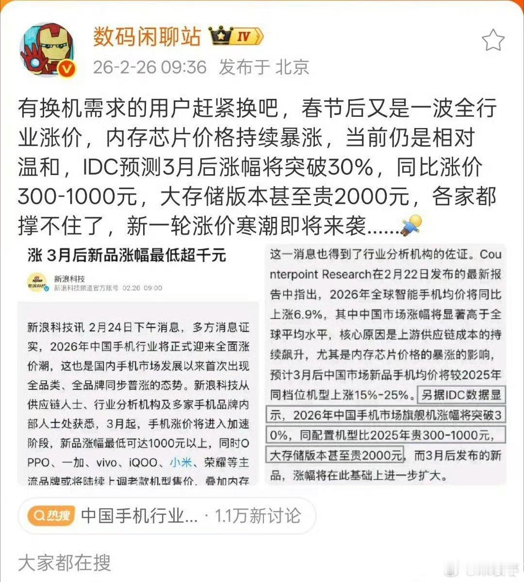 3月手机价格会集体暴涨,涨幅有可能突破30%,同比涨价300-1000元,大内存版本甚至贵2000元,这也太恐怖了吧!无论对消费者还是厂商都压力山大!