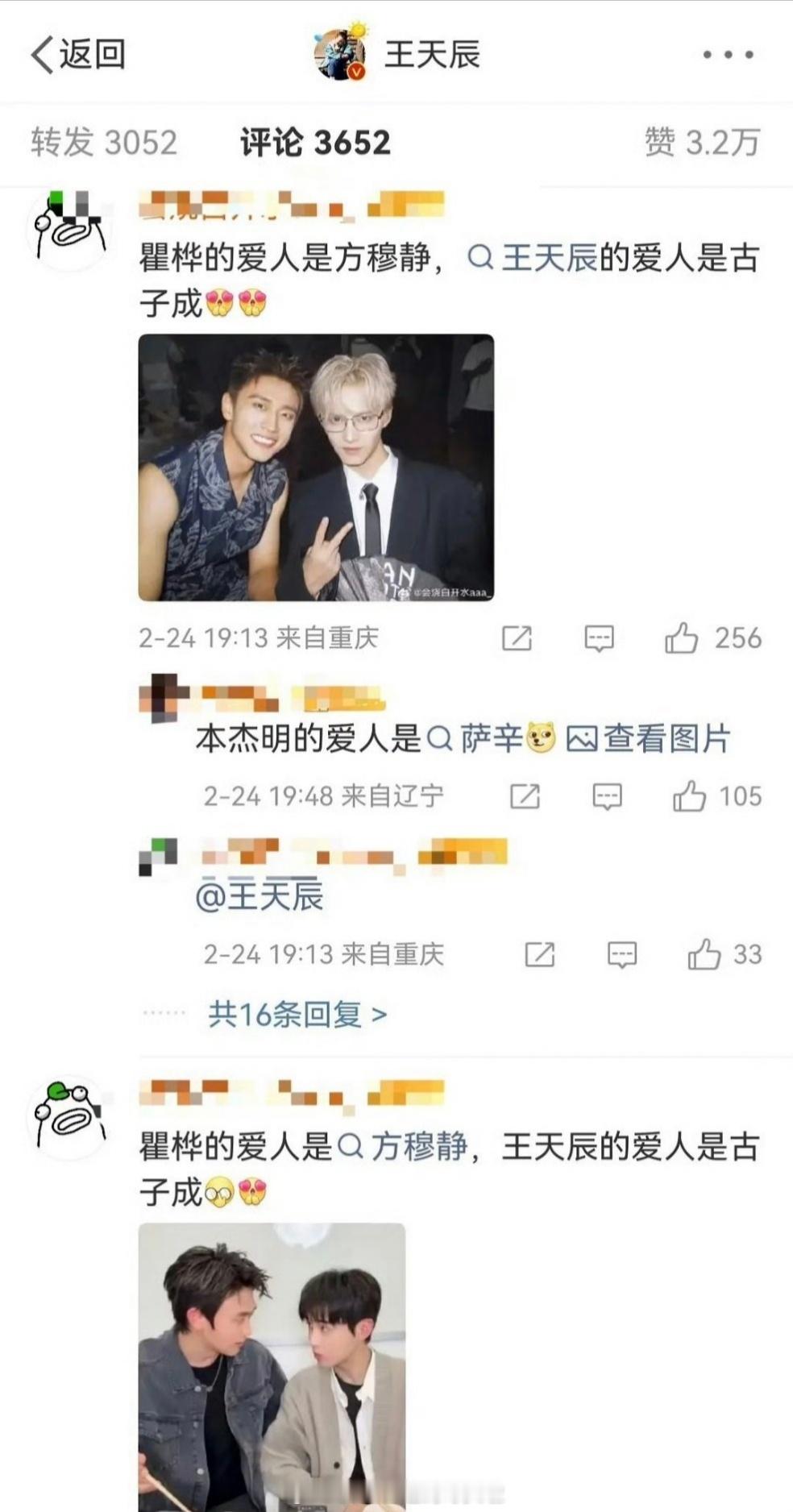 王天辰晒和郭晓婷的亲密合照,配文我的爱人方穆静。结果评论区被cp粉贴脸了,“本杰明的爱人是萨辛,王天辰的爱人是古子成”。白色橄榄树当初靠bg剧里麦bl有了点水花,结果现在后遗症来了。纯真年代的爱情 王天辰 春节档最忙演员