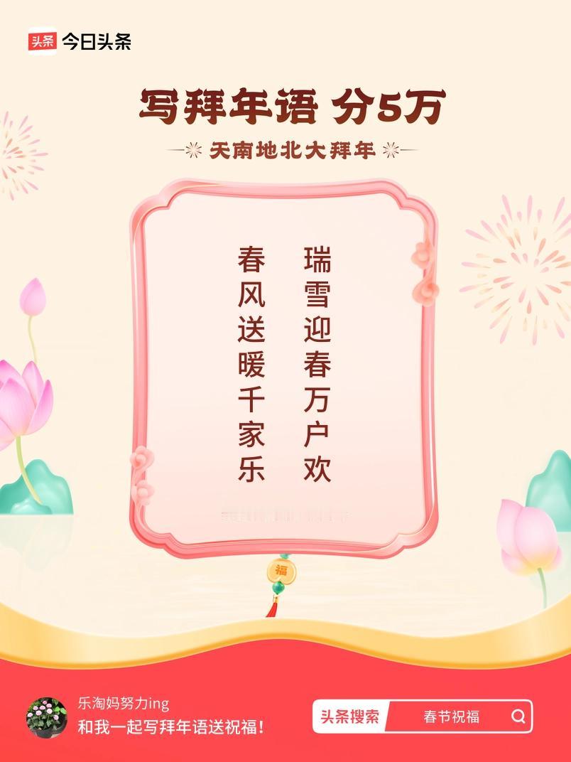 写拜年语送祝福新春拜年送祝福!我的祝福是:“春风送暖千家乐,瑞雪迎春万户欢”!快来一起写祝福吧戳这里,一起领红包>