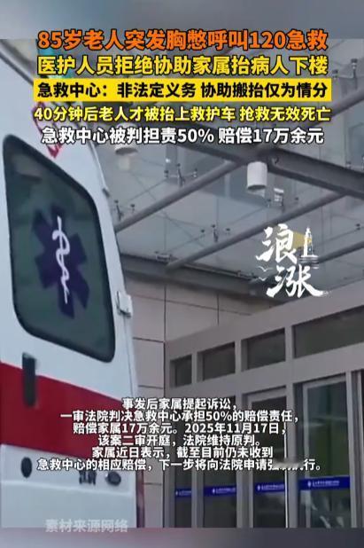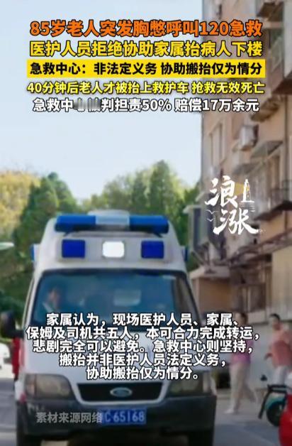“医者仁心呢?”山西阳泉,一家住5楼的85岁老人突发急病。可救护车行驶到楼下后,医护人员就是不同意上楼抬人,就算家属乞求,甚至愿意掏钱给报酬,他们都无动于衷,一直拖到老人脸色发紫,快没呼吸了,医护人员才匆匆将老人抬下了楼。但因为错过了最佳救治时间以及救治行为不当,老人最终不幸身亡。老人的家属怒将急救中心告上法院,但急救中心却表示人员配备不足,且没有抬人的法定义务,所以不愿承担责任。 据悉,85岁的陈女士住在一栋6层无电梯楼的5楼。由于陈女士年龄大了,不太方便上下楼,所以子女们给她请了保姆住家照顾。 2024年6月9日晚上10点半左右,陈女士突然感到胸闷和呼吸困难,家属和保姆立即叫来了救护车。 当时有一名男医生和一名女护士提着医药箱上了5楼,他们对陈女士的身体进行了检查。陈女士当时意识清醒,她提醒保姆等下去医院前要记得拿好医保卡。 然而就在家属要求医护人员一起帮忙抬陈女士下楼时,却遭到了他们的拒绝。二人表示,没有义务帮忙搬运,需要家属自行处理,或报警处理。 家属立即打电话通知亲友,但由于时间太晚了,始终无法联系上人。此时陈女士那远嫁外地的女儿冯女士得知后,乞求医护人员帮忙抬下,事后会给报酬,但还是遭到了拒绝。 无奈之下,冯女士只得报警求助。可在警方安排警员上门途中,陈女士的病情突然加重。 这下那两位医护人员急了,他们顾不得什么义务不义务,立即将陈女士抬到楼下的救护车内进行救助。 4分钟后,救护车赶到医院,但陈女士已经无法自主呼吸了。次日凌晨2点多,陈女士经抢救无效死亡。 面对这次事件,冯女士非常地生气,她认为都是那两名医护人员不肯抬母亲下楼才导致错过了最佳救治时间。 因此,冯女士就将急救中心告上了法院,倒不是为了赔多少钱,只是想要个说法,医护人员是否有义务抬人? 在冯女士起诉后,法院找了司法鉴定机构对陈女士的死亡原因做了鉴定。 结果显示:1、急救中心对陈女士的心律失常处置不当,未及时使用肾上腺素等药物治疗。 2、根据规范要求,医护人员应当出动具备搬运病人能力的人。如果人手不够,应当指导协助家属及时搬运病人,但医护人员耗时40分钟才将陈女士搬到救护车上,这显然延误了救治时间。 3、在救护车上时,陈女士的心跳和呼吸出现停止情况,可医护人员对陈女士做的胸外心脏按压动作不规范。 4、陈女士在前两天就有胸闷情况,且年龄也大,救护车空间狭小,又在行驶过程中,所以操作未达到规范要求也情有可原。 最终,鉴定中心认为急救中心应当承担一半的责任。 但急救中心不认同鉴定结果,急救中心认为医护人员并没有法定的搬抬义务。而且在当地对于救护车的配备人员只有一名医生一名护士和一名驾驶员,根本没有医疗救护员的配备。 也就是说,医护人员帮抬患者是情分,并非本分。 可是一审法院却采信了鉴定结果,认定急救中心应当承担50%的责任,赔偿冯女士等家属17万余元。 对此,有不少人认为,一审法院判的赔偿太少了,急救中心应该承担大部分责任。 还有人认为,人员配备不足是急救中心该考虑的事,不是患者该考虑的,既然是急救而且是收费的,那患者就有权享有帮抬的服务。 冯女士也认为法院判决同等责任不对,于是提起了上诉。 那二审法院会怎么判? 《院前医疗急救管理办法》第20条规定,医疗救护员可以从事的相关辅助医疗救护工作包括: (一)对常见急症进行现场初步处理;(二)对患者进行通气、止血、包扎、骨折固定等初步救治;(三)搬运、护送患者;(四)现场心肺复苏;(五)在现场指导群众自救、互救。 由此可见,涉事急救中心应当在救护车上配备负责搬运的医疗救护人员,以备不时之需,而不是因为人员不足就否定法定的搬运义务。 此外,医护人员在对陈女士进行急救时,未及时搬运、未规范用药、未实施正确的胸外按压动作,所以急救中心是存在过错的。 但是陈女士的死因是自身疾病所致,而且在事发前两天陈女士已经感到身体有所不适。这说明陈女士对自身疾病的发生,存在放任的过错。 综上,一审法院认定急救中心和陈女士各担50%的责任,并没有不妥。 最终,二审法院驳回了冯女士等人的上诉请求,维持了一审判决。 可判决结果出来后,急救中心始终未支付这17万元,感觉就想赖掉这笔钱。 目前,冯女士已经准备申请强制执行。如果在强制执行后,急救中心还不肯还钱,或者采用暴力方式拒绝还钱的,那就要面临相应的刑事处罚了。 最后,没有规矩不成方圆,但在人的生死面前,规矩也可以靠边站站,此时人的生命权最大,必须尽一切手段救治,这才是医者仁心。 对于此案,您有什么看法?欢迎留言交流。