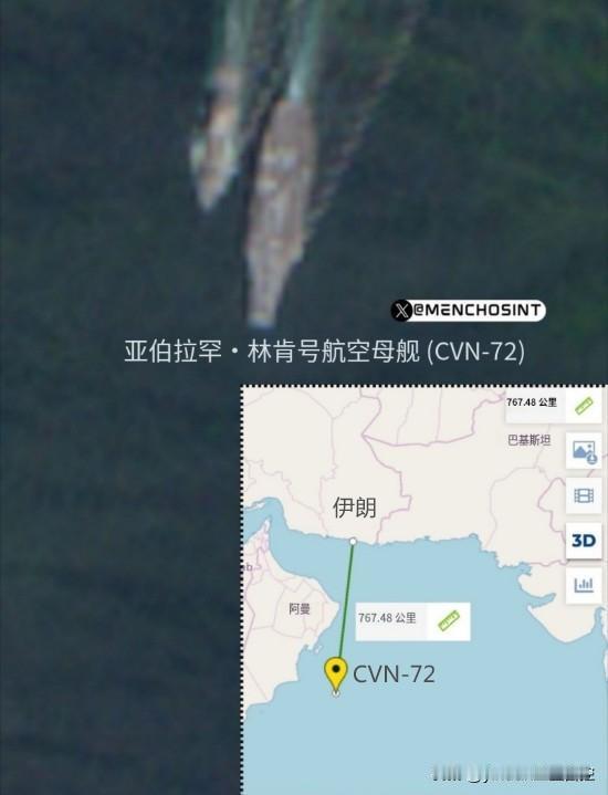 欧空局哥白尼计划下的“哨兵-2”高分辨多光谱卫星捕捉到了“林肯号”核动力航母(舷号CVN-72)的最新位置。其目前位于阿曼东南方向(也门东部)的阿拉伯海上,距伊朗边境真线距离约为767公里,正在向南航行并使用补给船进行补给。