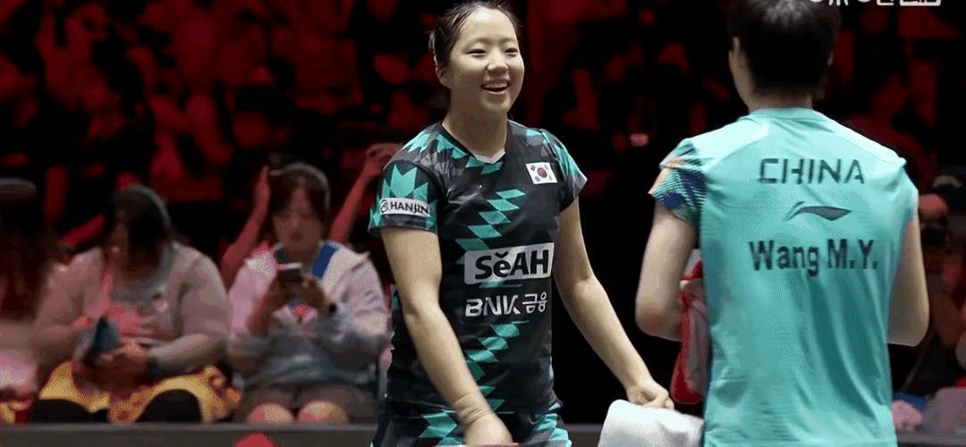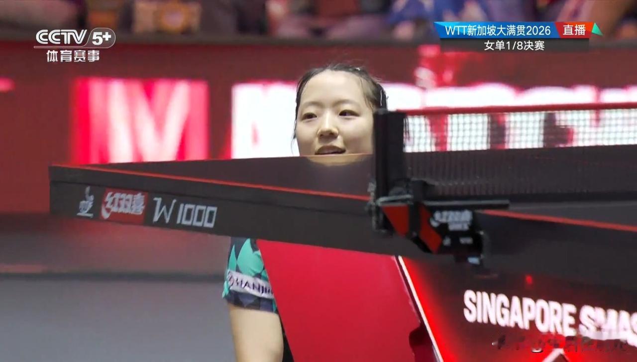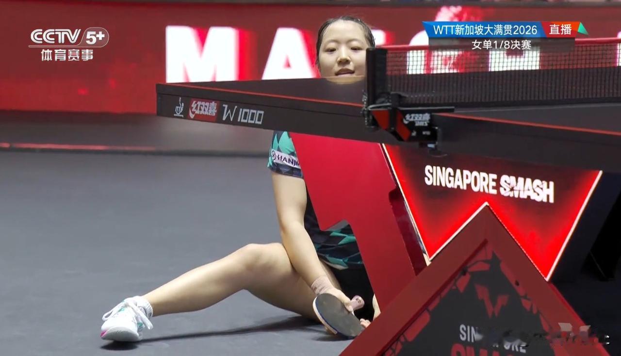 这个妹子挺讨人喜欢,都打得坐在地上了,还不忘对着镜头莞尔一笑……输了比赛,也是堆满笑容与对手握手。 WTT新加坡大满贯女单1/8决赛,申裕斌1:3不敌王曼昱。 比赛过程中,第一局就打到21:19,打出了羽毛球的比分。要知道,这一局是在申裕斌落后,将比分追平并赢下来的。 乒乓球比赛,一局比分能将打到21:19,可见比赛的激烈程度,而申裕斌的确打得非常顽强,全场都在搏杀,每一板都在玩命,但也扳不动王曼昱。 赛后,王曼昱对申裕斌说:“你今天打得很好”。 申裕斌笑着说:“太累了”。