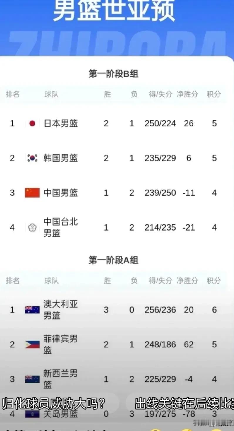男篮客场以87比80艰难逆转日本队,取得男篮世界杯亚预赛的首胜,与此同时,台湾省队也已77比65战胜韩国男篮。 今晚战罢,男篮世界杯亚预赛中国队所在的B组第一阶段排名如下: 日本男篮两胜中国台湾省男篮,一负中国男篮,积五分排名第一; 韩国男篮两胜中国男篮,一负中国台湾省男篮,积五分排名第二; 中国男篮一胜日本男篮,两负韩国男篮,积4分,排名第三; 中国台湾省男篮一胜韩国男篮,两负日本男篮,积4分排名第四。 四支队伍形成了连环套,出线形势仍然不是十分明朗,中国男篮仅凭得失分暂时压中国台湾省男篮一头,如此以来,中国男篮和中国台湾省男篮的两场比赛将显得十分重要,如果不能两场全胜,就有极大可能比淘汰出本小组。 纵观今晚中国男篮的比赛,其中张镇麟的发挥堪称灾难,全场各项数据均为尴尬的鸭蛋。这位昔日的男篮“巨星”,如今已成“鸡肋”,滑落之快令人惊愕。此战过后,他很可能就此与国家队告别。 不论怎样,希望中国男篮能够赢下最后的来三场比赛,昂首挺进决赛圈!