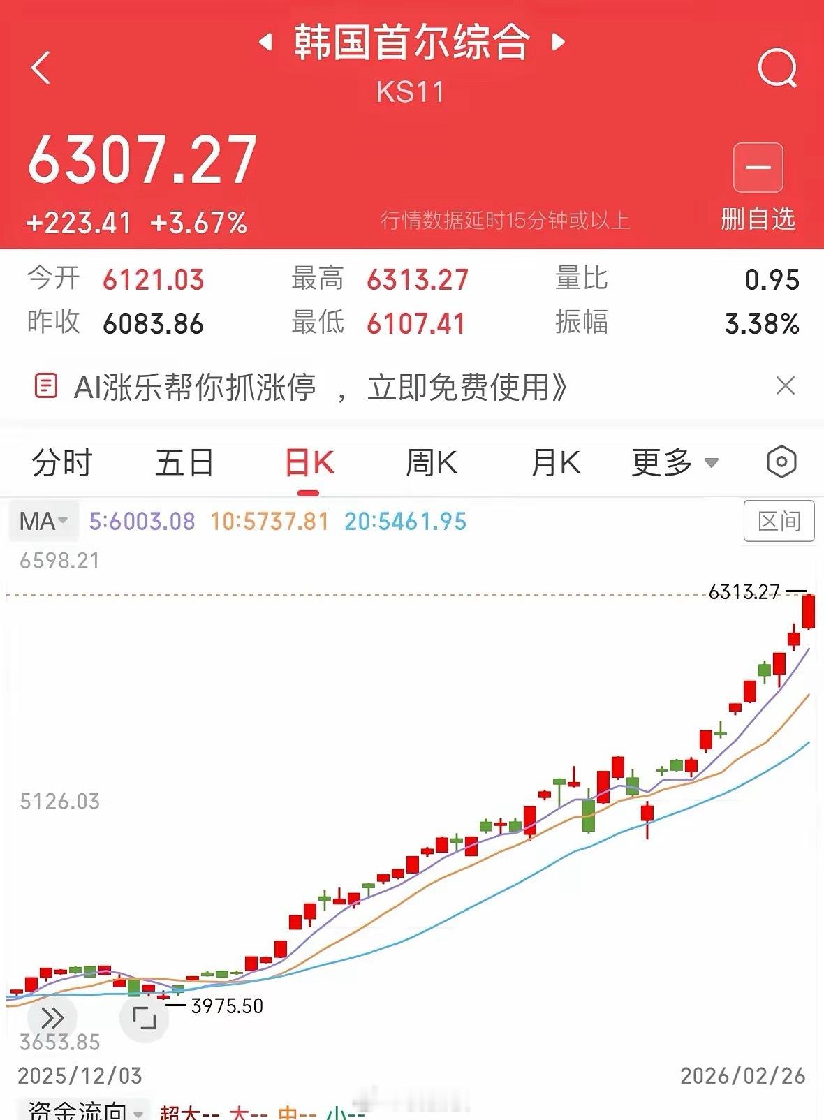 韩国股市今日收盘突破6300点,为何这么牛是击鼓传花吗:韩国股市难道不怕涨多了风险加大吗?2月26日今天上午还在6200点,很多人看回调,结果收盘大涨3%,突破6300点,很多韩国人连夜跑回回国开户交易,生怕错过了AI时代的全民共富。有赚钱效应,源源不断资金进入,股市就不断新高,他们就不怕击鼓传花吗?这才叫自信,虽然是三星、SK等半导体权重大涨,但市盈率并不高,业绩好。不像印度股市,涨一点就害怕,企业跑出来说击鼓传花,全世界都找不出像印度这么垃圾的股市,指数涨个1%就降温,每天冲高回落。恭喜韩国股市牛冠全球,恭喜韩国牛马走向共同富裕。