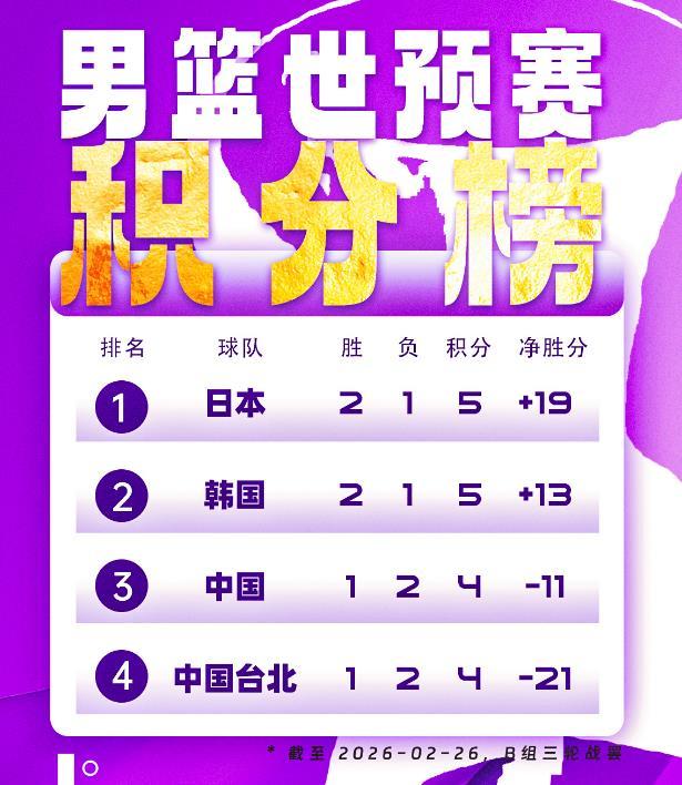 中国男篮赢下日本队后,在世预赛小组赛积分榜上目前排名第三,根据世预赛的出线规则,小组赛日本、韩国、中国、台北四支球队,排名前三的球队将从小组出线。 目前小组赛三场比赛过后,日本队2胜1负积5分,净胜19分,排名小组第一; 韩国队2胜1负积5分,净胜13分,排名小组第二; 中国队1胜2负积4分,净胜-11分,排名小组第三; 台北队1胜2负积4分,净胜-21分,排名小组第四; 3月1日中国男篮将于台北队比赛,如果中国男篮赢下台北队将有很大机会获得小组出线。