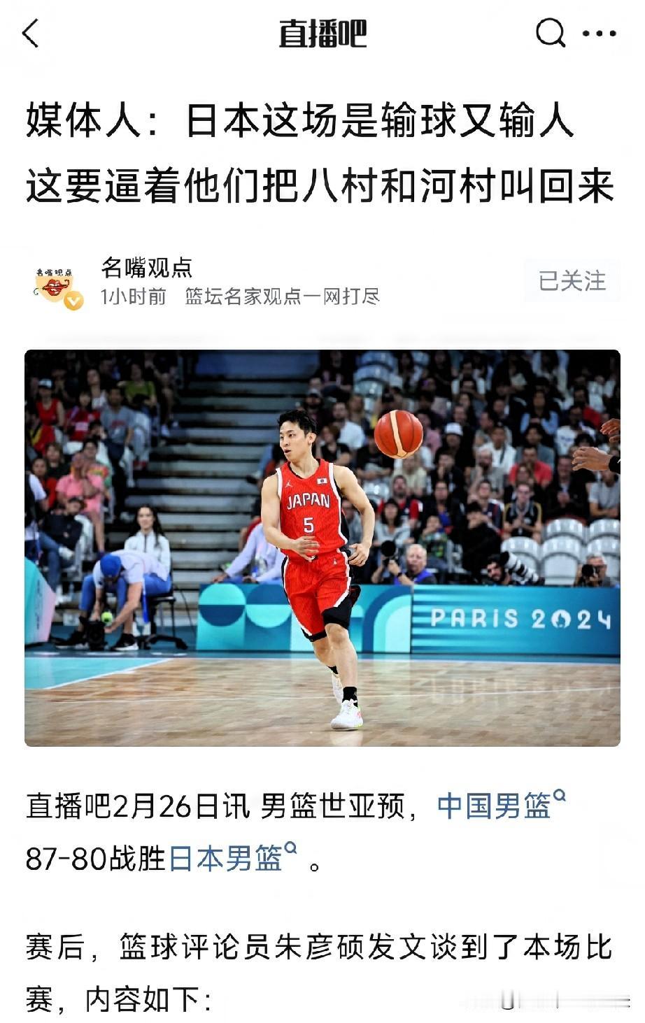 逆转日本!篮球评论员朱彦硕称:日本这场是输球又输人,想赢中国队,唯有把河村和八村塁叫回来;恕我直言,中国男篮假如归化一个小外援,再把杨瀚森叫回来,根本不怕!张镇麟真该看看比赛录像!对位渡边被压制,这么高天赋和身体素质,却在比赛中存在感很低,多看看渡边处理球防守,还是那句话,12位球员都得发挥,能走更远