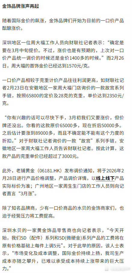 一条黄金手链将涨价超2万多家金店3月将涨价一条手链涨价超两万!周大福、老铺黄金等酝酿金饰提价