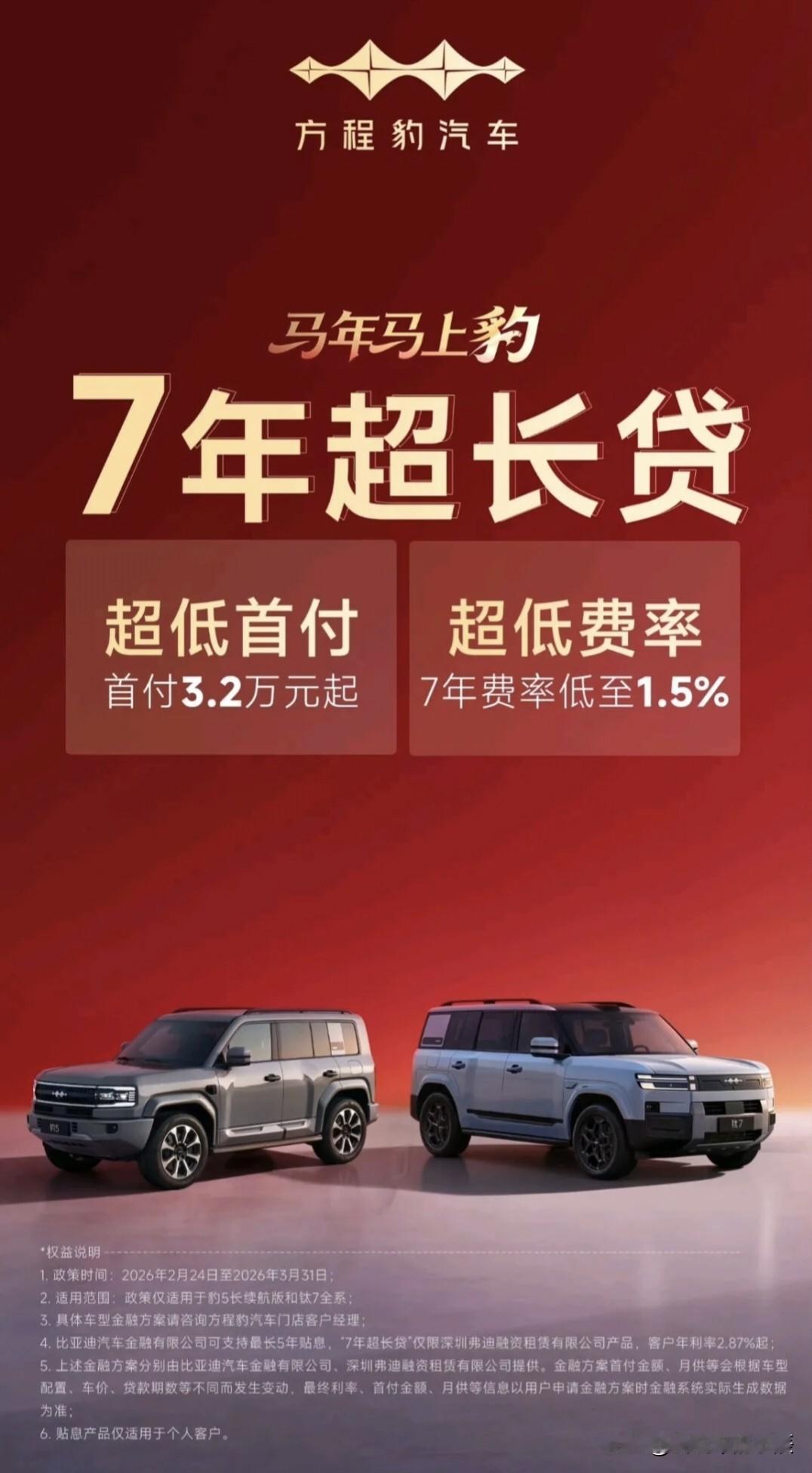 比亚迪开年放大招!7年超长贷+3.2万超低首付,马年“豹”款来袭! 继友商推出7年超长贷之后,@比亚迪海洋网 与 @方程豹汽车 率先响应跟进,用真金白银给消费者送大礼!这波“开年焕新豹”,主打一个诚意满满! 🌟 核心亮点速览,专治各种犹豫: 💰 【超长贷 超低息】 行业罕见的7年超长贷来了,费率低至1.5%!拉长还款周期,月供无压力。 🚗 【方程豹 硬核宠粉】 想入手 豹5 或 钛7 的朋友注意!超低首付低至3.2万起,就能把这头性能猛兽开回家! 🌊 【海洋网 全系狂欢】 海洋网全系开年福利重磅来袭! ✨ 3年0息 / 7年低息,灵活搭配更省心 ✨ 0首付起,买车门槛直接“打下来” ✨ 日供低至29元起!每天一杯奶茶钱,换一辆高品质座驾。比亚迪