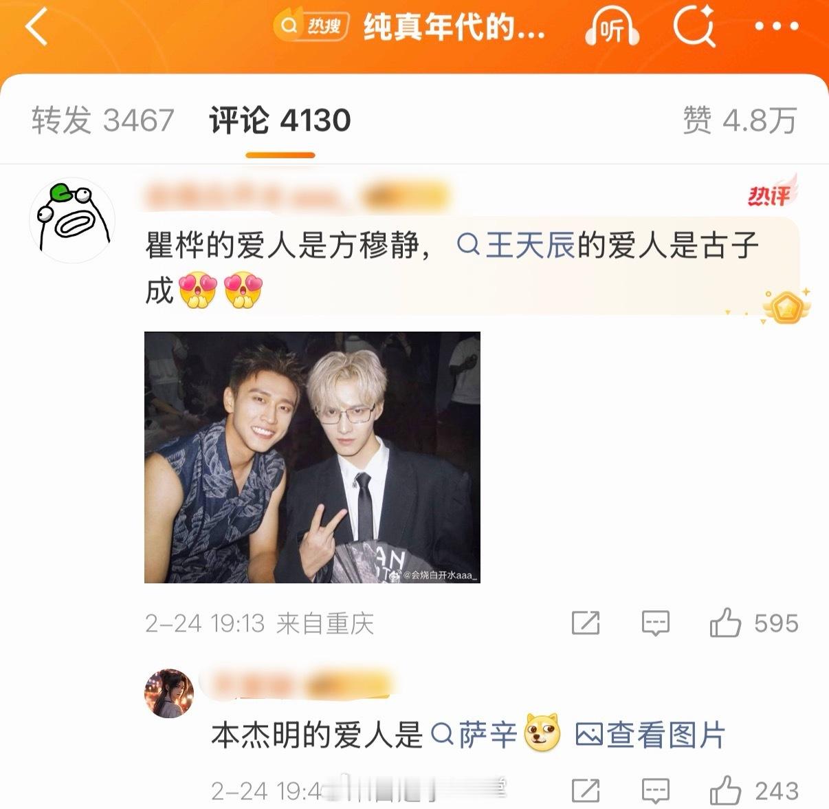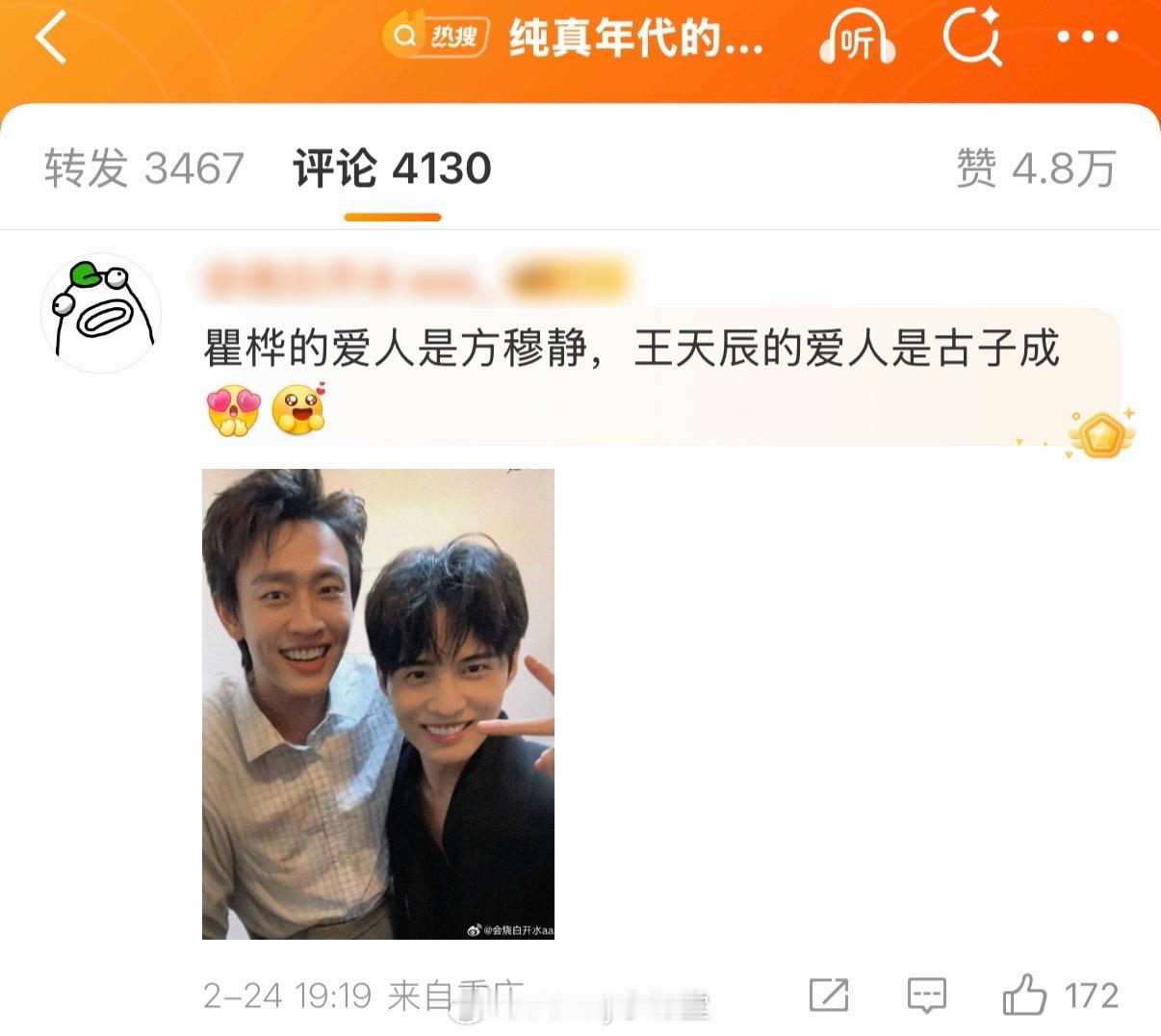 王天辰 上桌俺不中了,王天辰为了新剧做BG营业,评论区全是刻骨明辛的CP粉贴脸开大,说王天辰真正的爱人是古子成!内娱男星只要麦过麸,那就一辈子都别想逃啦