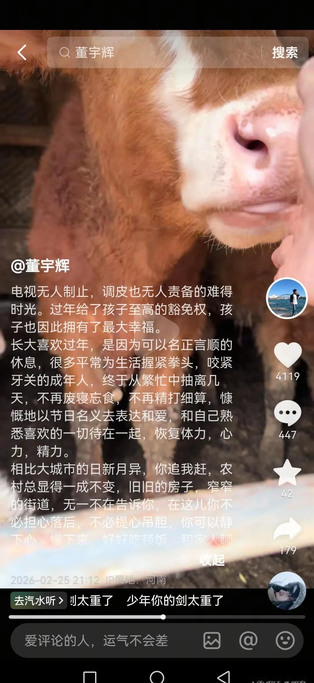 你见过最狠的对比是什么? 不是功成名就,而是脑梗十几年的爷爷,突然在病床上清晰地喊出了他的名字。 董宇辉当场泪如雨下。 春节长假,他懒散到心生愧疚。 吃妈妈手擀面,油泼辣子一拌,暂时忘了所有糟心事。 可最深处的刺,是他写在文里那句:在农村,不必提心吊胆。 你细品。 一个全网瞩目的人,最大的慰藉竟是“不必担心落后”。 这平静背后,是多少看不见的喧嚣? 所以那个瞬间才值了。 爷爷一声“辉娃子”,胜过千万掌声。 这世界吵嚷着让你奔跑,但最终让你觉得一切都值得的,往往是来时路上,那个始终认得你、等你回家的人。 不是出走半生,而是归来时,你仍是我最熟悉的少年。 这或许才是奋斗全部的意义。