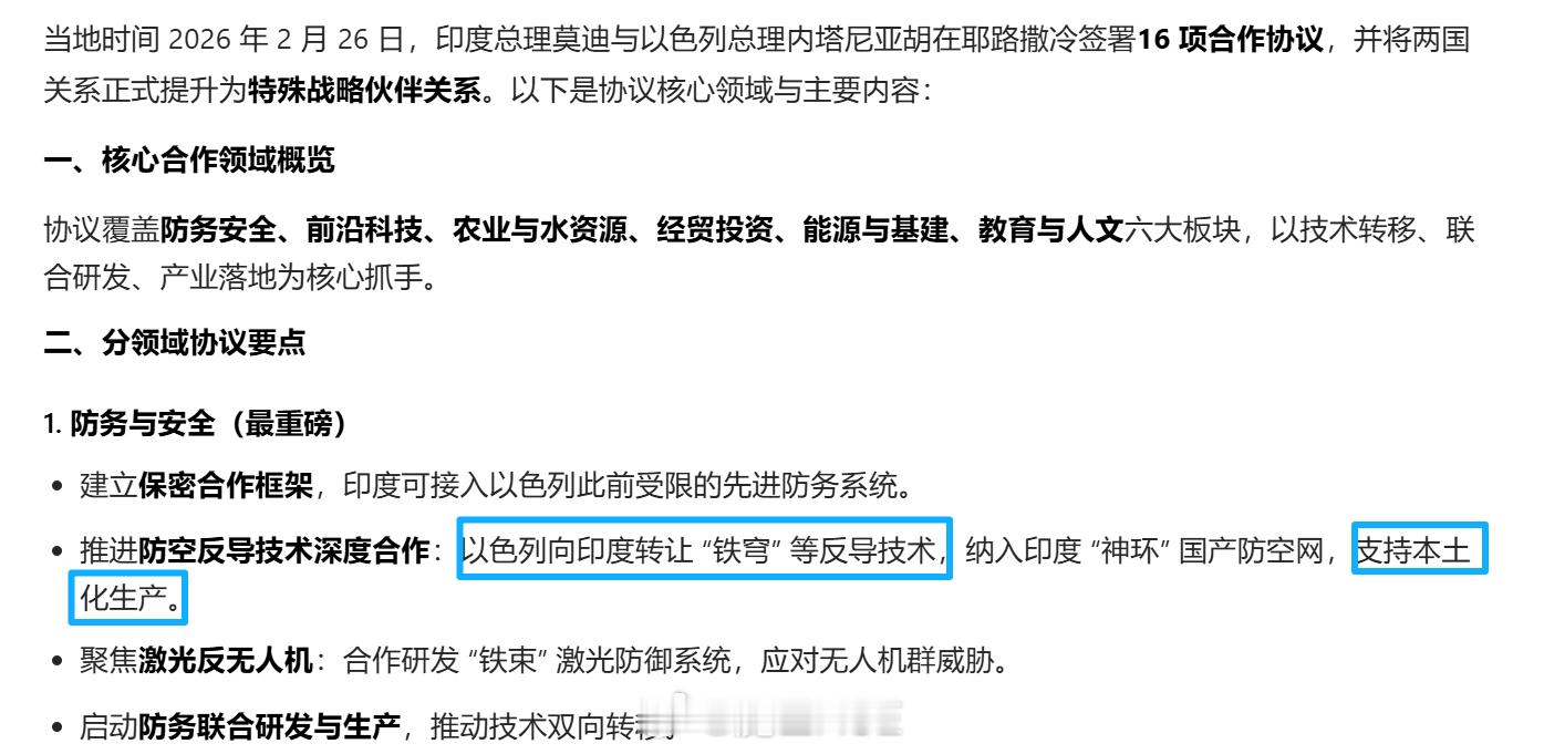 美军福特号航母驶向中东施压伊朗伊朗烽火问鼎计划 美军的福特号航母重新出洞,印度也紧跟着一起作妖开始。印度与以色列签署了16项合作,15项都是陪衬,最重磅的,就是以色列向印度提供“铁穹”防空导弹技术,印度与以色列进行联合生产。印度在通过阵风战机大订单拿到了阵风战机本土化生产权之后,终于又拿到了一个高端军品产线。在这个时机点,印度窜访以色列,本身就意味着,印度一脚把伊朗踹开了。想想就好笑,去年印度和巴基斯坦打起来的时候,伊朗去和印度觥筹交错。真是绿头阿三行为。魔笛老仙拿到铁穹防空产线之后,感动地直飙胡话——以色列是公,巴拉特是母!以色列与伊朗去年的12日战争,一个最典型的问题,就是后期阳痿无力,防空导弹弹药量不足。难道现在想通了要让印度生产导弹填补自己的缺口?开什么玩笑,就冲印度光辉战机的光辉战绩,谁敢用它们的产品。而且现在马上就要开打了,才开始签技术转让协议,很明显不是为这次动手准备的。哪怕把印度人个个变成婆罗神,也搓不出那么多导弹来。这次的协议,实质上,就是通过16份合作协议,吊着印度拒绝与伊朗交好。因为一旦印度再和伊朗交好,以色列就可以拒绝转让防空技术。印度为了那一口技术,咬着牙也得一脚踹开伊朗。实质上,以色列是利用导弹技术,彻底将印度的站位拉到自己这边。万一以色列潜艇摸到霍尔木兹海峡与伊朗交火,或者特种“恐怖分子”炸了霍尔木兹海峡的油轮,都能在印度就近停靠。短期内,恶化伊朗周边的国际环境,然后自己猛吸一波血攒一下战争资本。长期内,俘获一个站以色列这边的大国,最后发展为印度不再偷偷购买伊朗石油,将伊朗经济持续锁住。以色列动手的一块新拼图也完成了。
