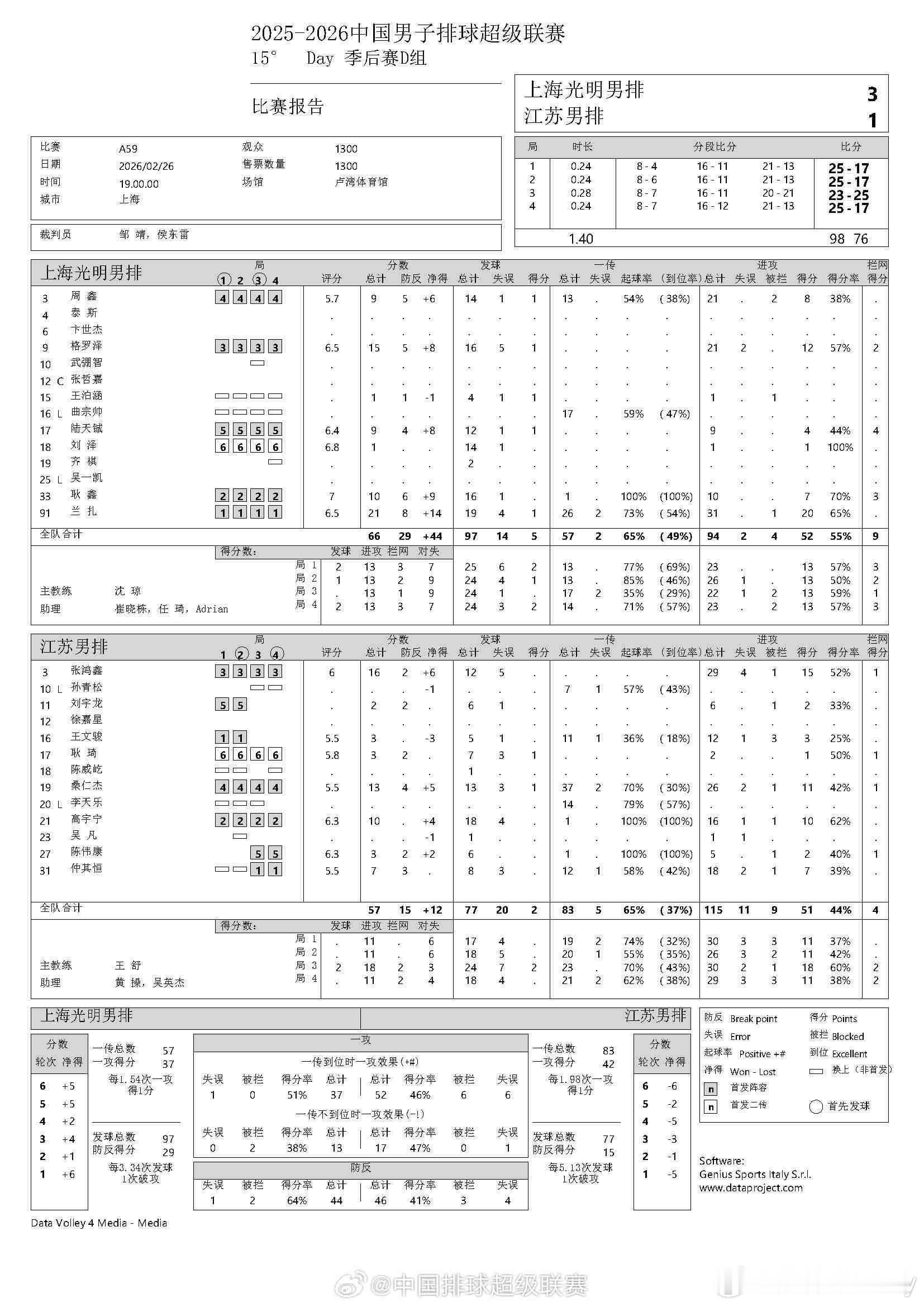 35岁的兰扎迎来加盟上海男排后的排超首秀,表现出色砍下全场最高的21分(31中20中1被拦1发),扣球双率65%&61%。